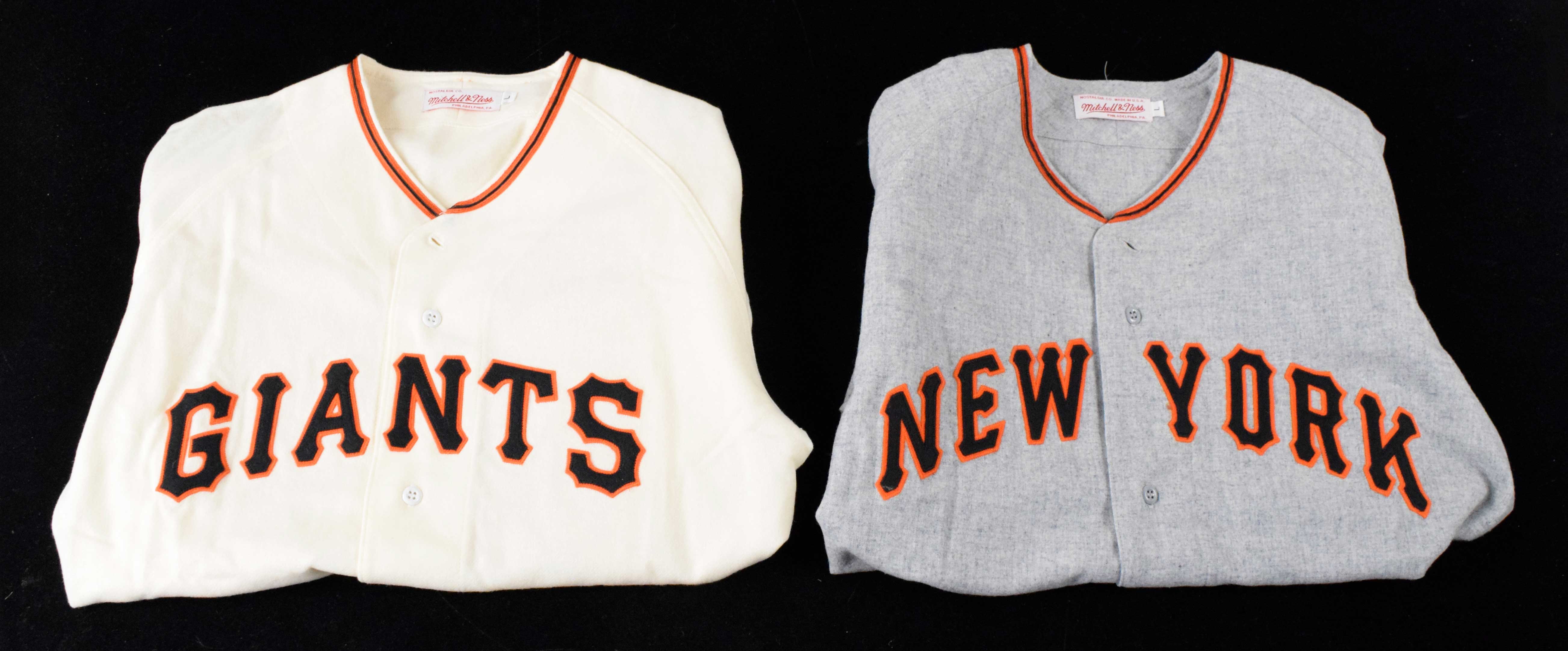 Description:Pair of Willie Mays 1951 New York Giants replica jerseys by Mitchell & Ness. Cream color home and road grey flannel 1951 New York Giants Willie Mays replica jerseys by Mitchell & Ness. Both remain in unused condition in size large. Includes certificate of provenance from the Willie Mays Collection: NM