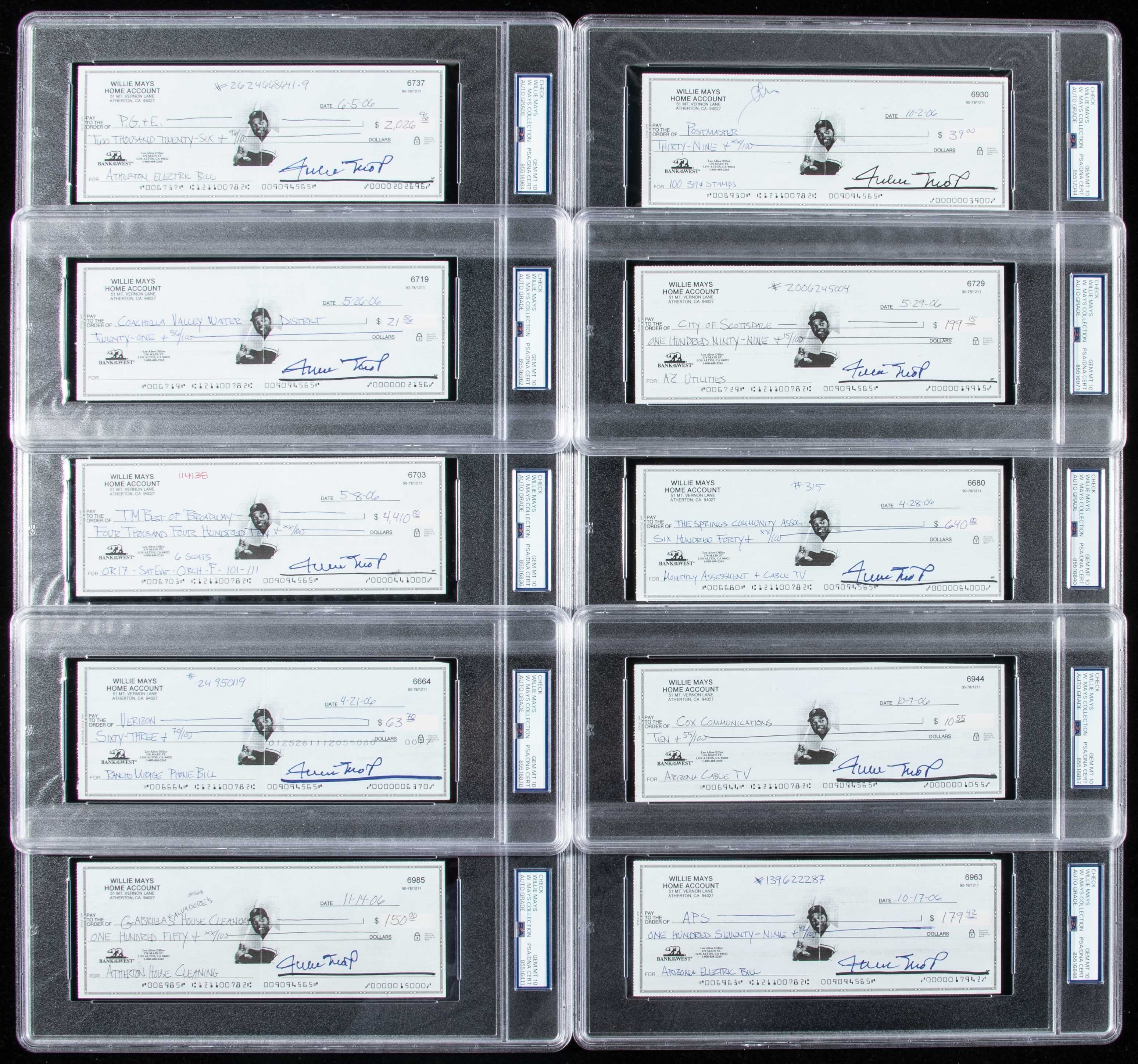 Description:Lot of (50) Willie Mays autographed checks (PSA/DNA 10 Gem Mint). Large lot of 2006 dated checks, each signed "Willie Mays" at lower right. All autographs are graded "10 Gem Mint" by PSA and there are varying degrees of typical handling and bank cancellation wear (a touch more pronounced in some cases). Each is authenticated and encapsulated by PSA with "W.Mays Collection" noted on the label: Gem Mint