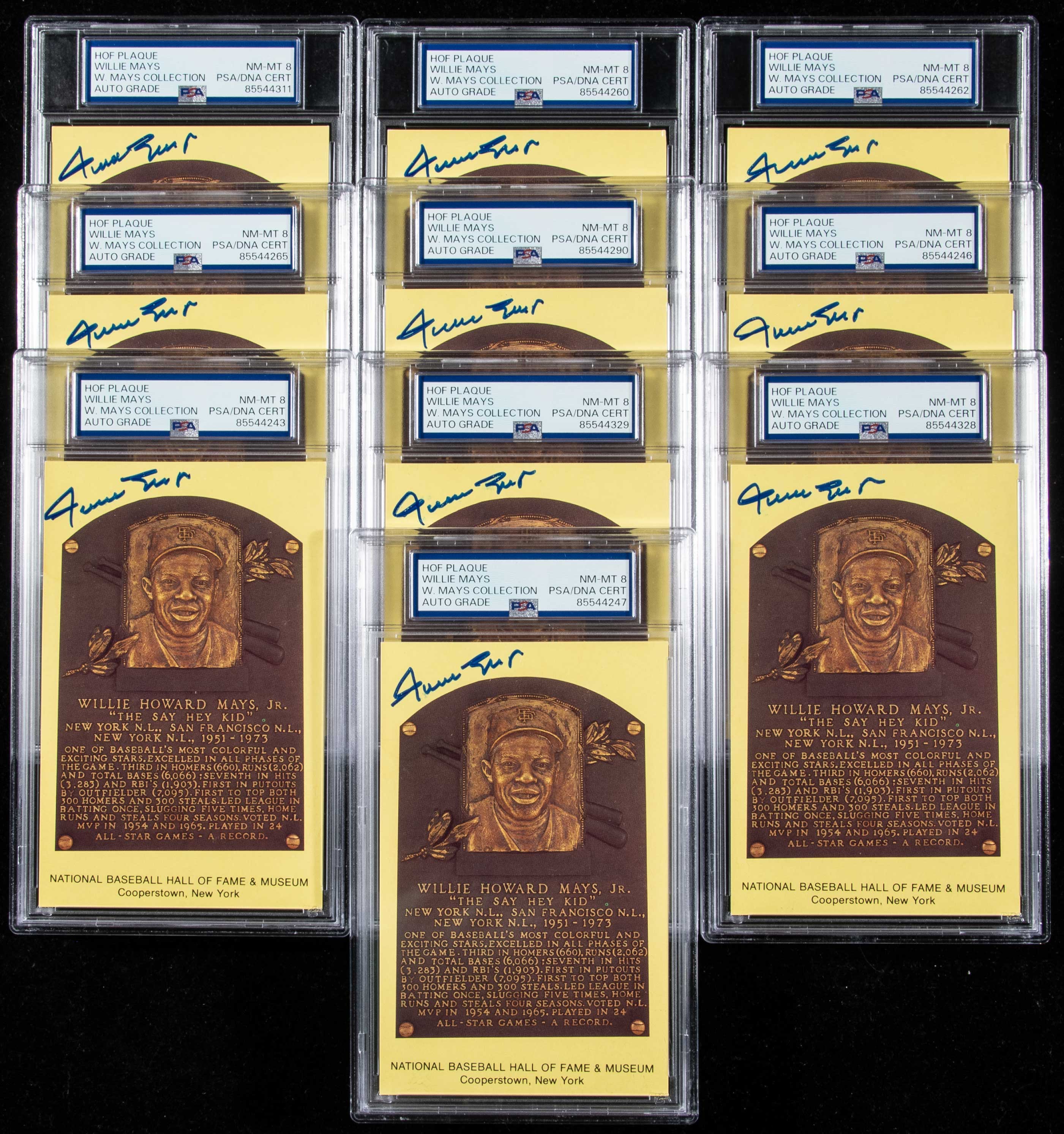 Description: Lot of (10) Willie Mays autographed Hall of Fame Plaque postcards (PSA/DNA 8 NM-MT). Group of ten yellow Hall of Fame plaque postcards each signed by Willie Mays in blue sharpie at the top margin. Signatures rate 8 out of 10. Encapsulated by PSA/DNA (8 NM-MT) with special "W.Mays Collection" pedigree labeling: NM-MT