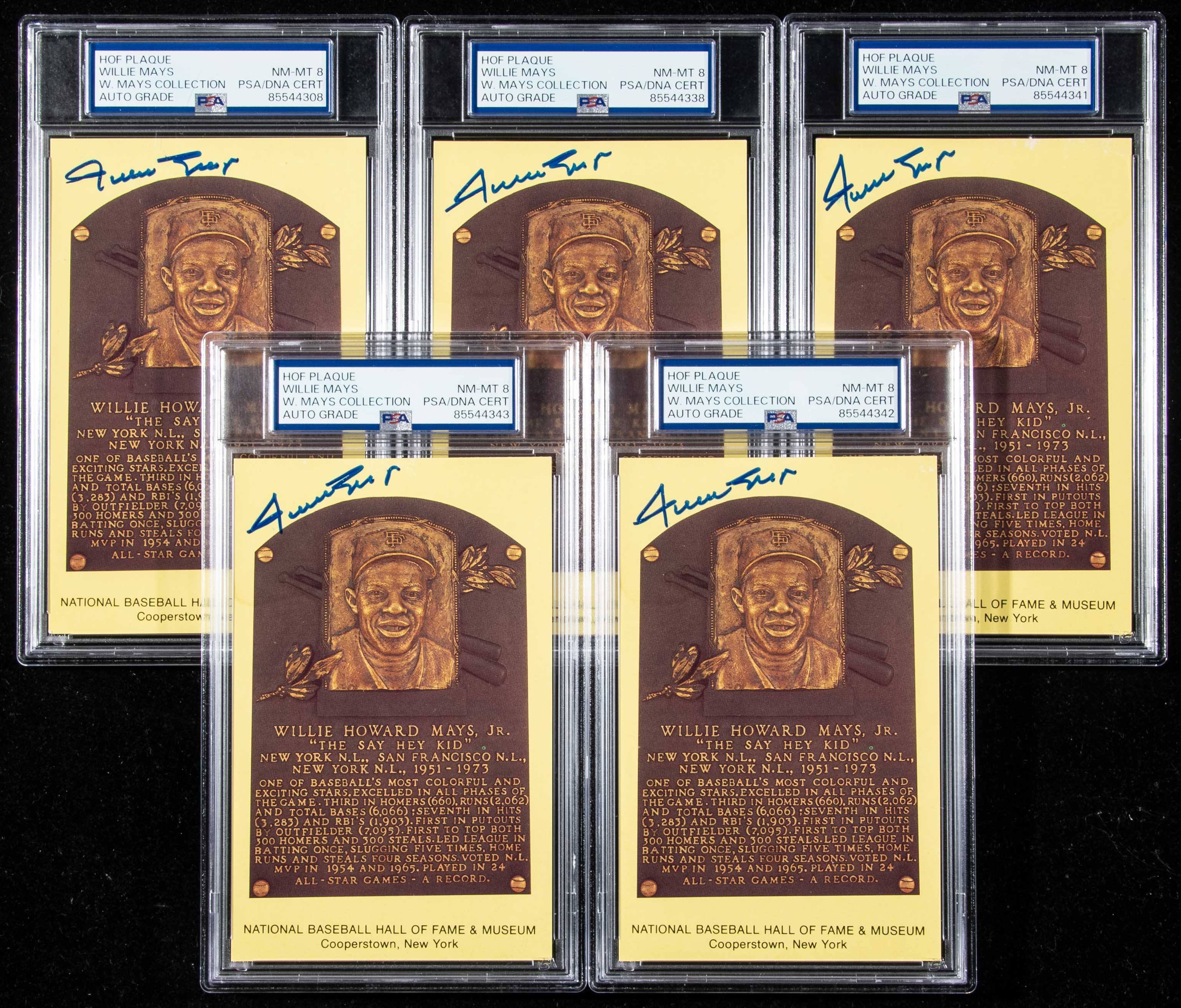 Description:Lot of (5) Willie Mays autographed Hall of Fame Plaque postcards (PSA/DNA 8 NM-MT). Group of ten yellow Hall of Fame plaque postcards each signed by Willie Mays in blue sharpie at the top margin. Signatures rate 8 out of 10. Encapsulated by PSA/DNA (8 NM-MT) with special "W.Mays Collection" pedigree labeling: NM-MT