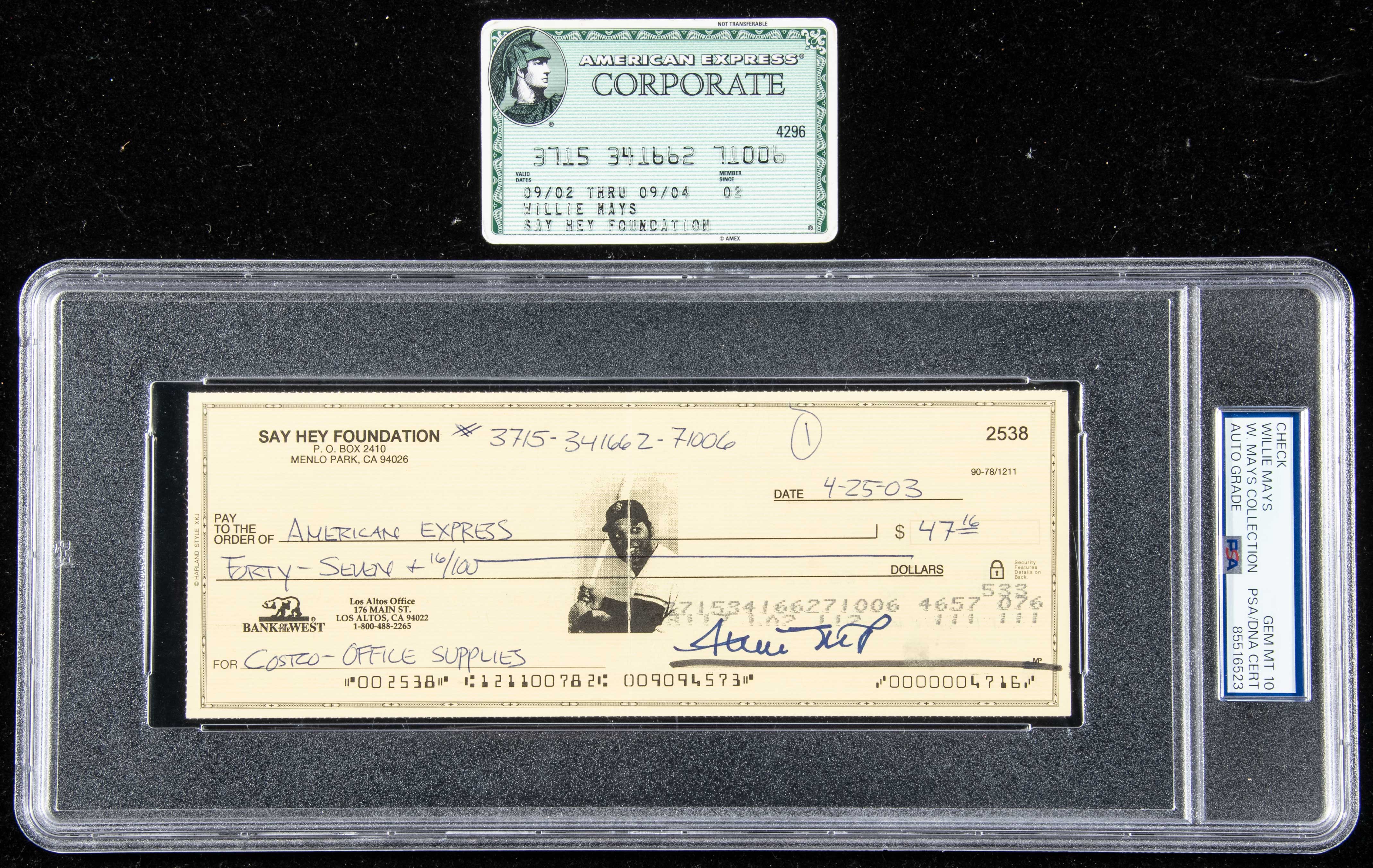 Description:Willie Mays American Express card with related 2003 autographed check (PSA/DNA 10 Gem Mint). Includes American Express Corporate credit card which was issued to Willie Mays and the Say Hey Foundation; 2003 dated check signed "Willie Mays" at lower right. It was made payable to American Express and relates to the same account as the card (with the credit card number written on front). Check is encapsulated by PSA/DNA (graded 10 Gem Mint) with "W.Mays Collection" noted on the label. Certificate of provenance from the Willie Mays Collection: Gem Mint