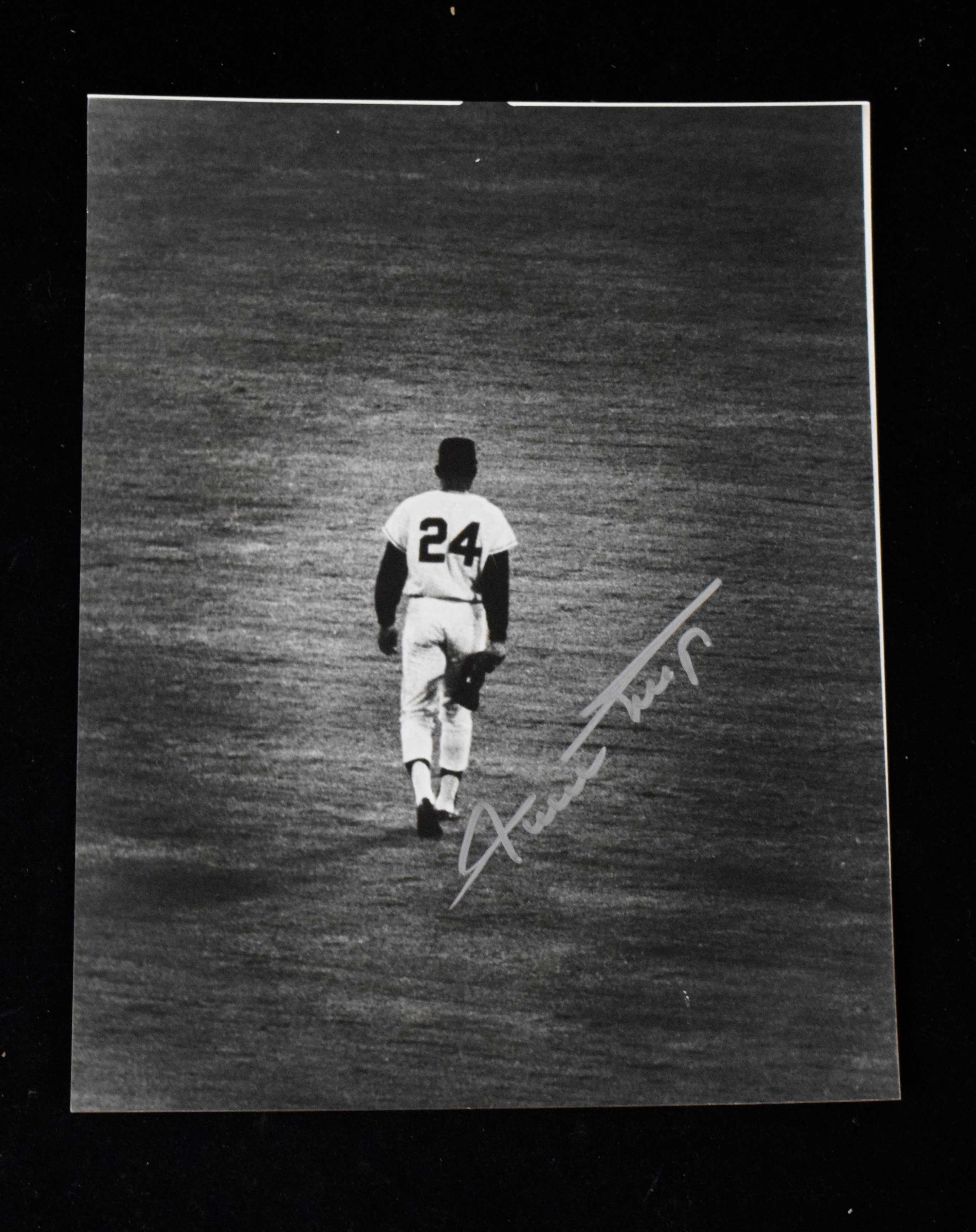 Description:Willie Mays autographed photograph. Black and white 11"x14" image showing Mays walking with his back to the camera showcasing his iconic number 24. Signed in silver paint pen rating 8 out of 10. Unique signed Mays image was the only example of its type within the collection. Includes auction LOA from JSA and certificate of provenance from the Willie Mays Collection: NM