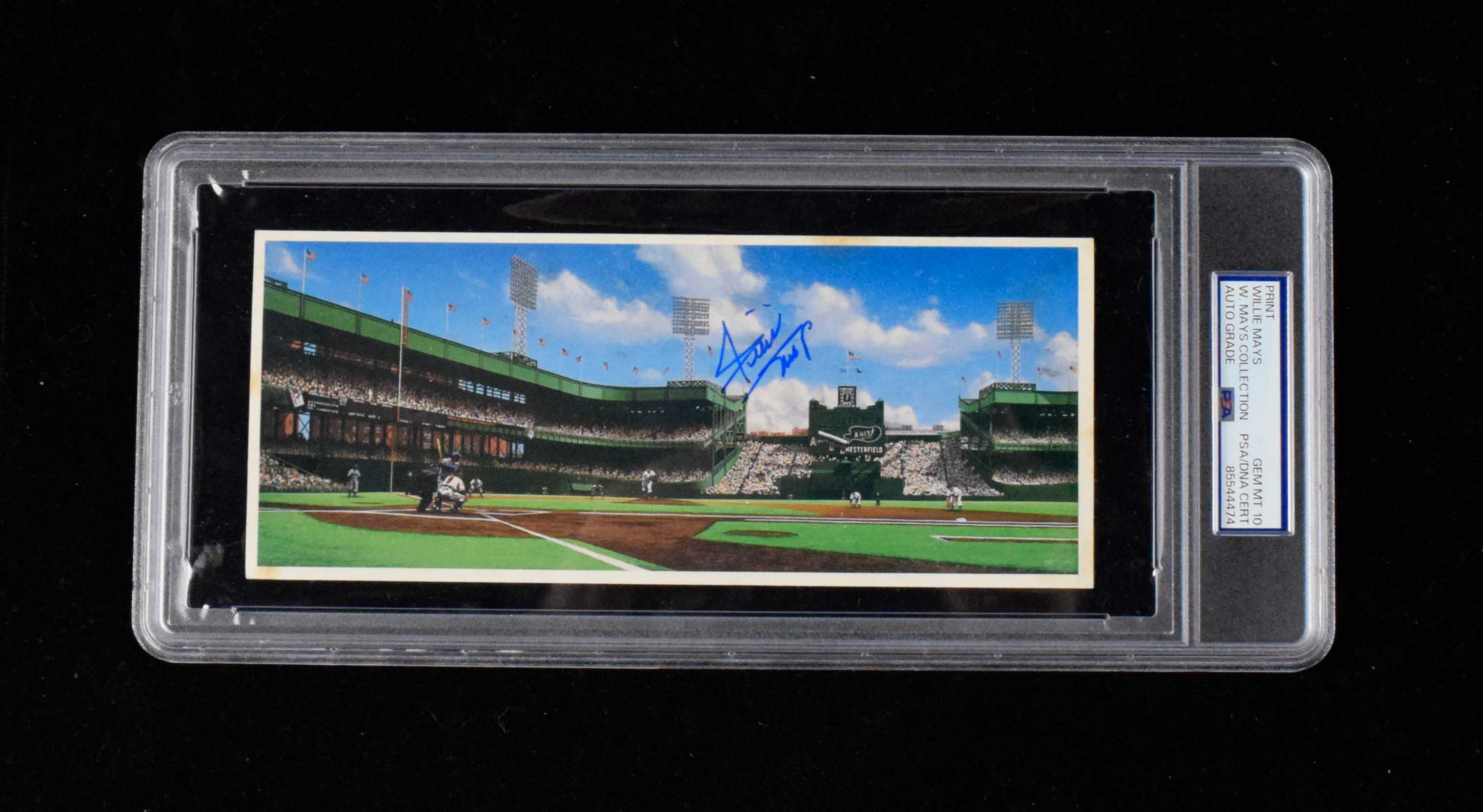 Description:Willie Mays autographed Polo Ground promotional postcard by Bill Purdom (PSA/DNA 10 GEM MINT). Color postcard issued to promote the Polo Grounds panoramic print by artist Bill Purdom. Signed in blue felt tip marker across the front rating a perfect 10 out of 10. Postcard itself has a few areas of age toning to the perimeter. Encapsulated by PSA/DNA (10 GEM MINT) with special "W.Mays Collection" pedigree labeling: Postcard: EX, Signature: GEM MINT