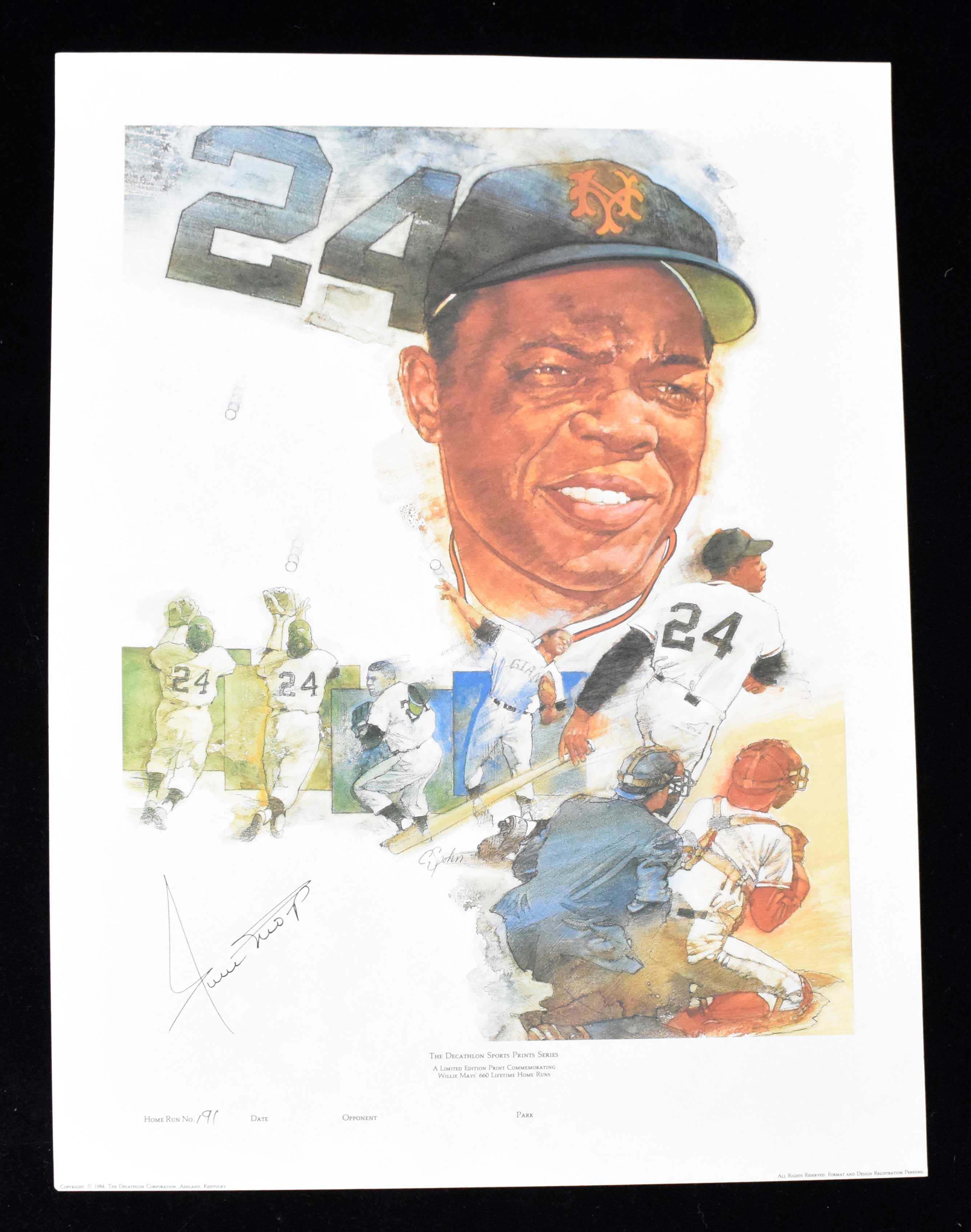 Description:Willie Mays autographed limited edition color lithographic print. Large format color lithographic print depicting several vignette images related to Mays' career. Signed in black felt tip marker at bottom left with handwritten (not by Mays) numbering at the bottom corresponding to his 660 career home runs. Numbered Home Run 191 with date and stadium left blank. Includes auction LOA from JSA and certificate of provenance from the Willie Mays Collection: NM
