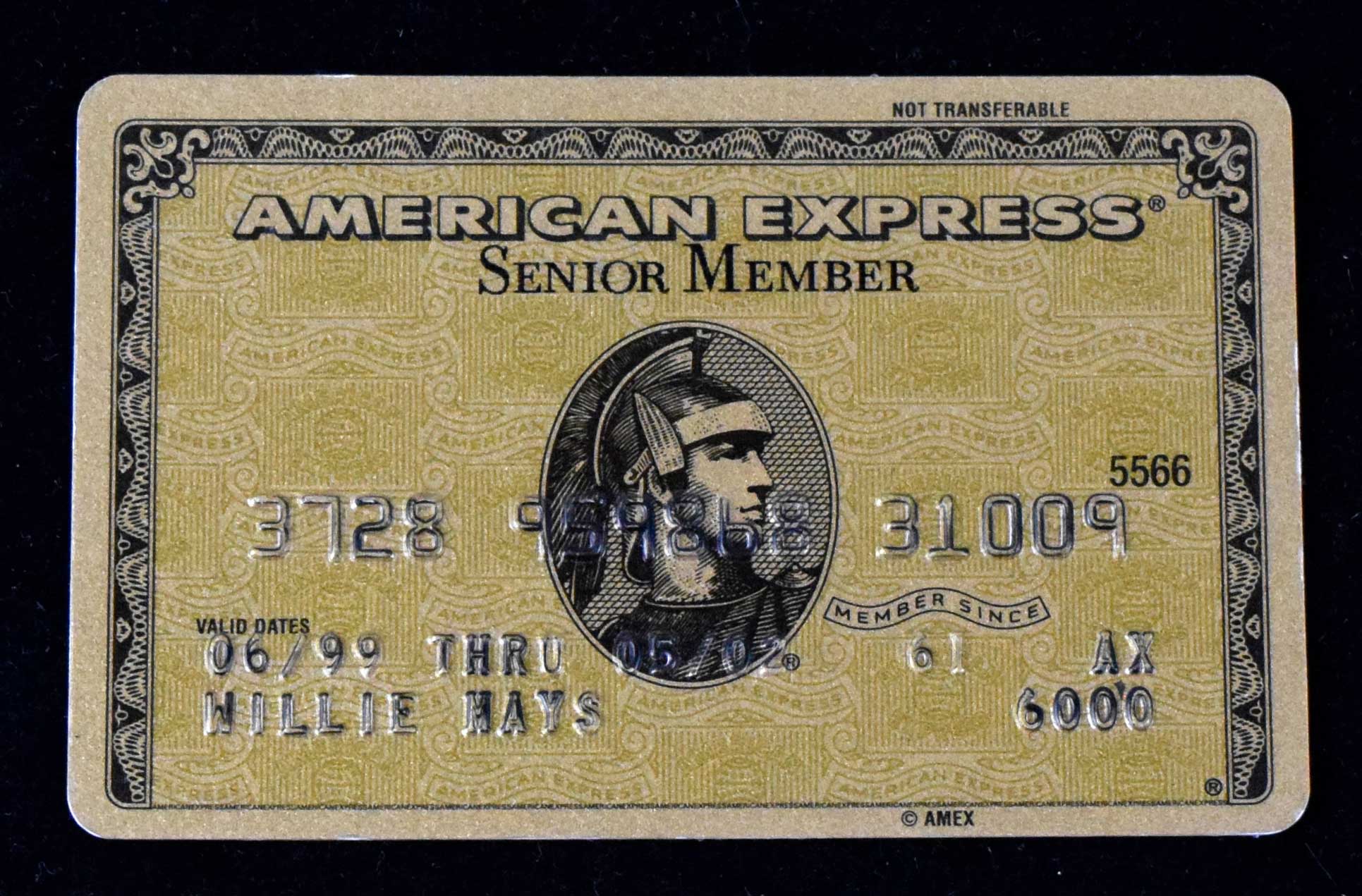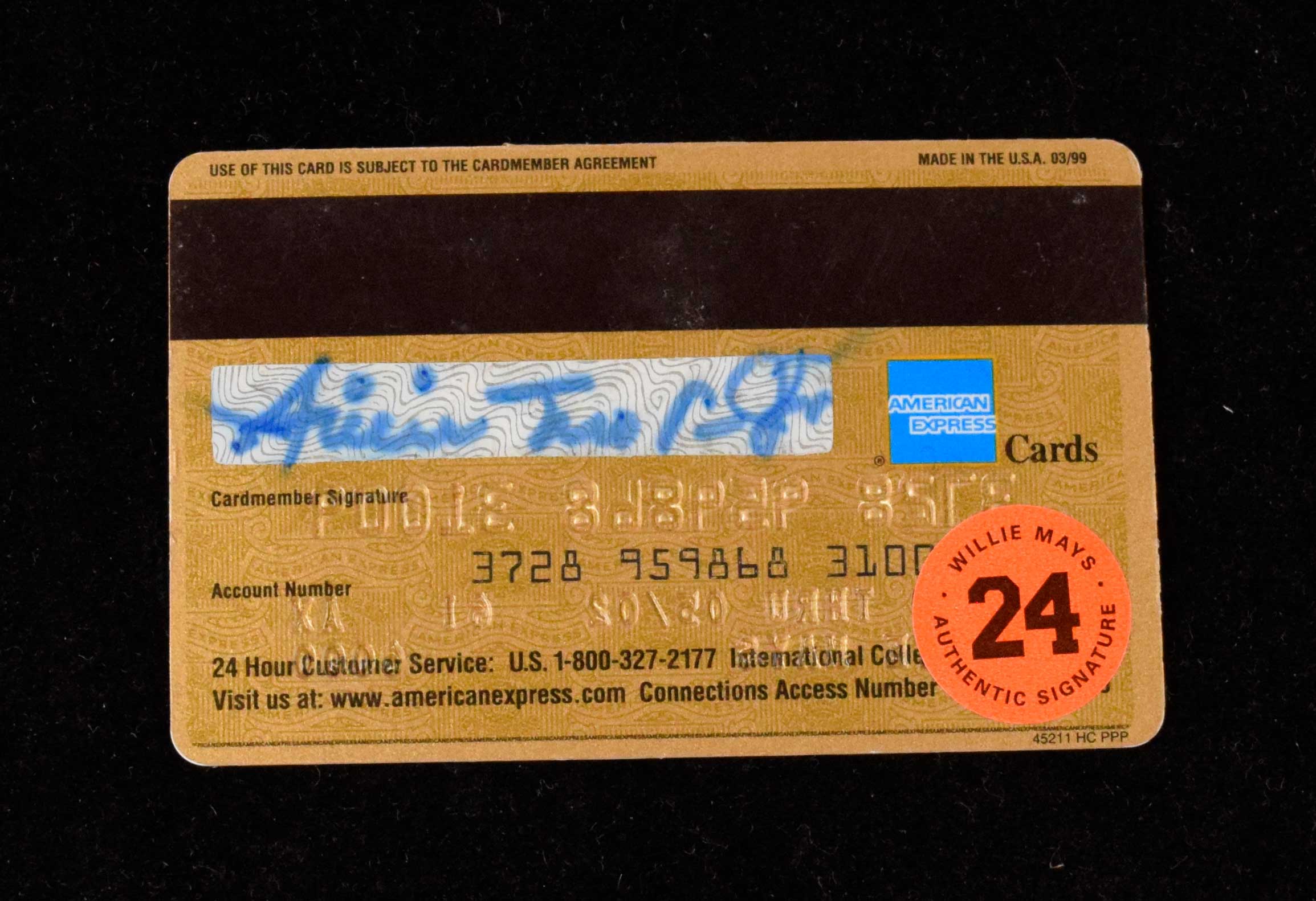 Description:1999 Willie Mays autographed American Express Gold Credit Card. Original American Express Gold Credit card as used by Mays having his name in raised lettering across the front. Back has been signed with very rare full name "Willie Mays Jr." signature in blue sharpie rating 8 out of 10. Willie Mays 24 Authentication labeling affixed and includes certificate of provenance from the Willie Mays Collection: EX-MT