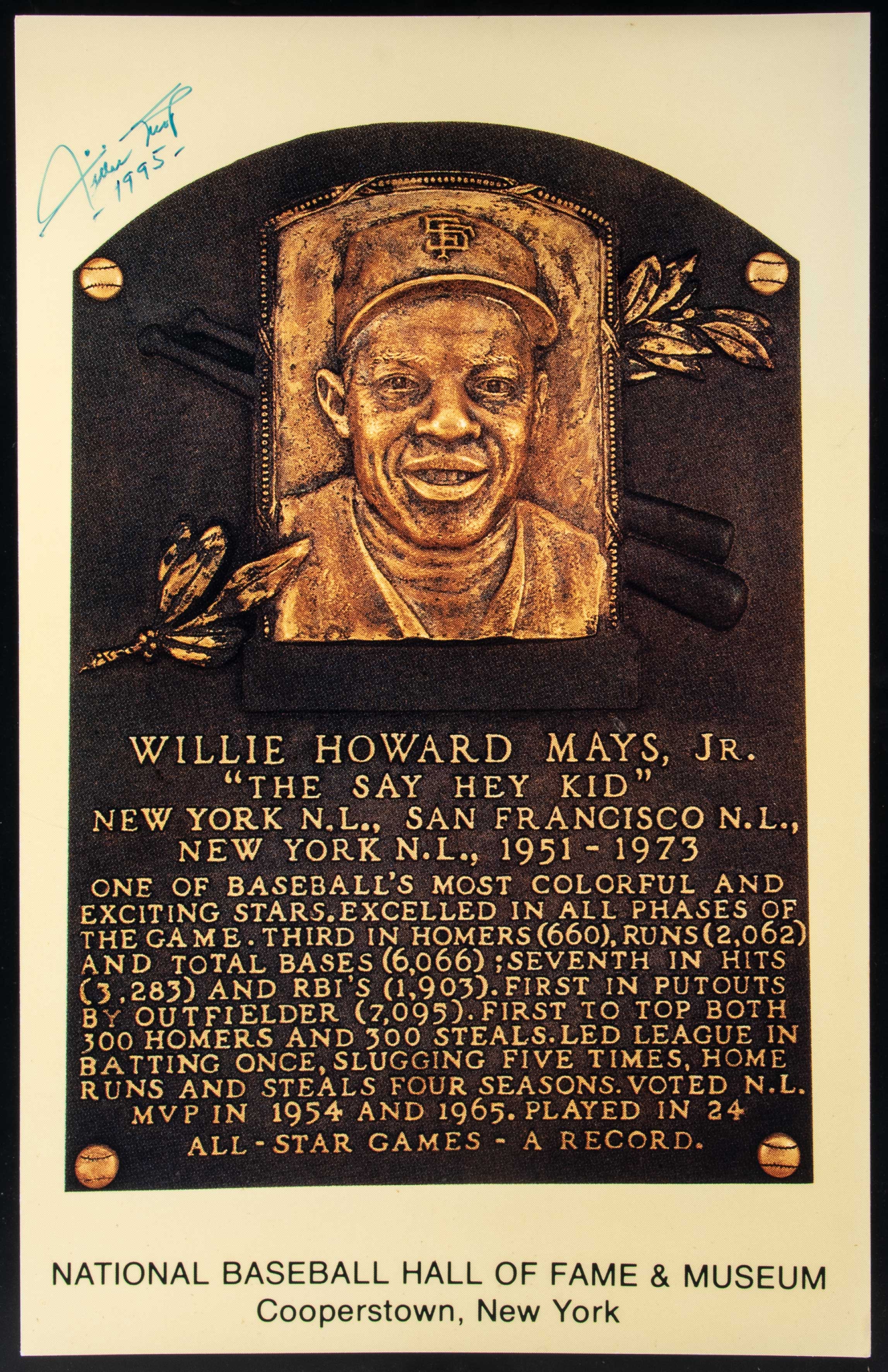 Description:Willie Mays autographed large format Yellow Hall of Fame Plaque display. Framed 30"x40" rendering of Mays' Yellow Hall of Fame plaque postcard signed at top left, "Willie Mays 1995" in blue sharpie. Signature rates 8 out of 10 with some minor surface wear to the display front. Includes auction LOA from JSA (autograph) and certificate of provenance from the Willie Mays Collection: EX-MT