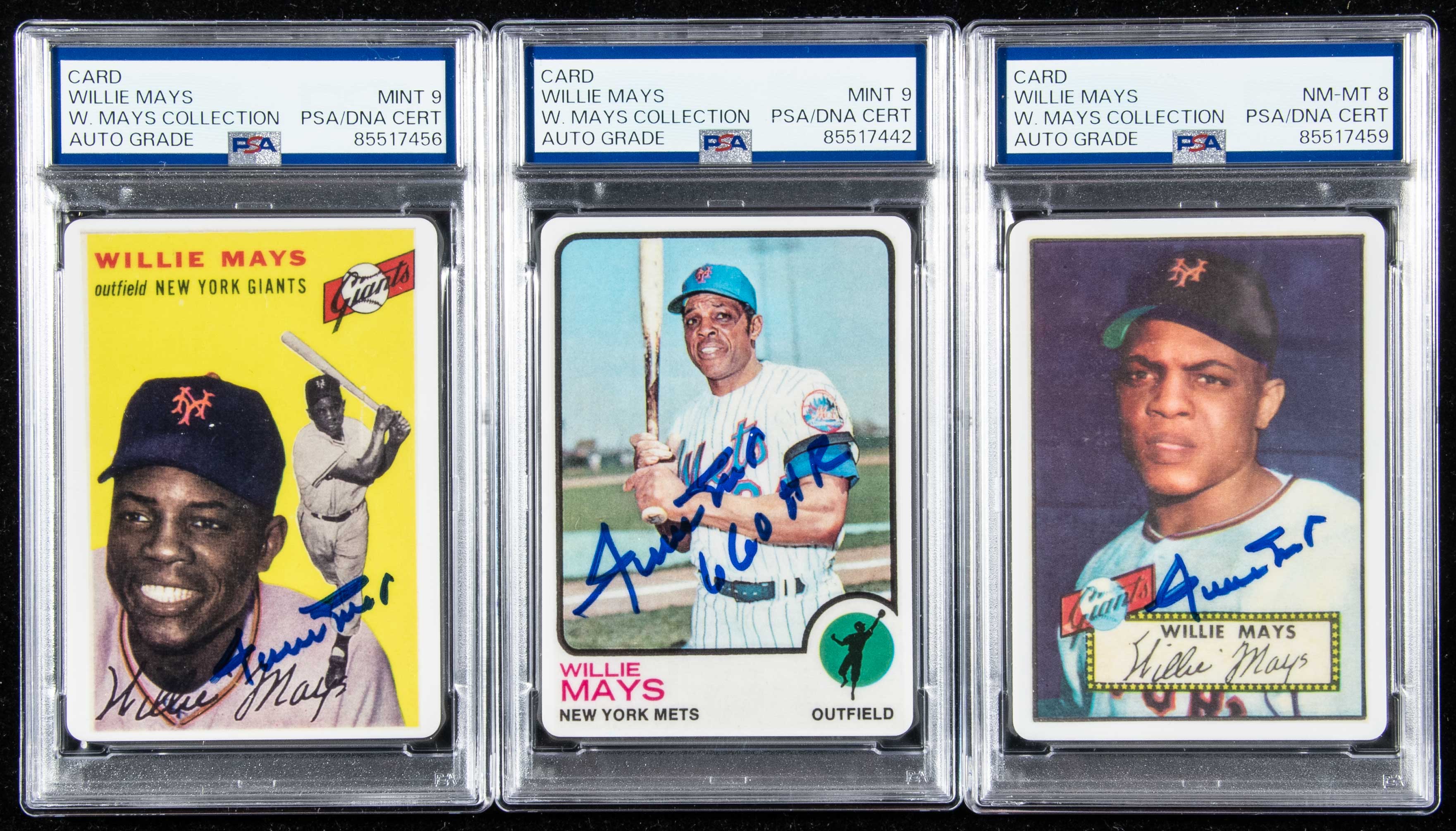 Description:Set of Willie Mays autographed Topps porcelain baseball cards (PSA/DNA). Trio of limited edition porcelain baseball cards produced in 1999 by R&N China Co. replicating the 1952, 1954, and 1973 Topps baseball card issues. The offered examples were among a very small number given to Mays for his collection and as such remain unnumbered on the back from the standard series of 660 total. Encapsulated by PSA/DNA (One at 8 NM-MT and two at 9 MINT) all with special "W.Mays Collection" pedigree labeling: Range NM-MT-MT