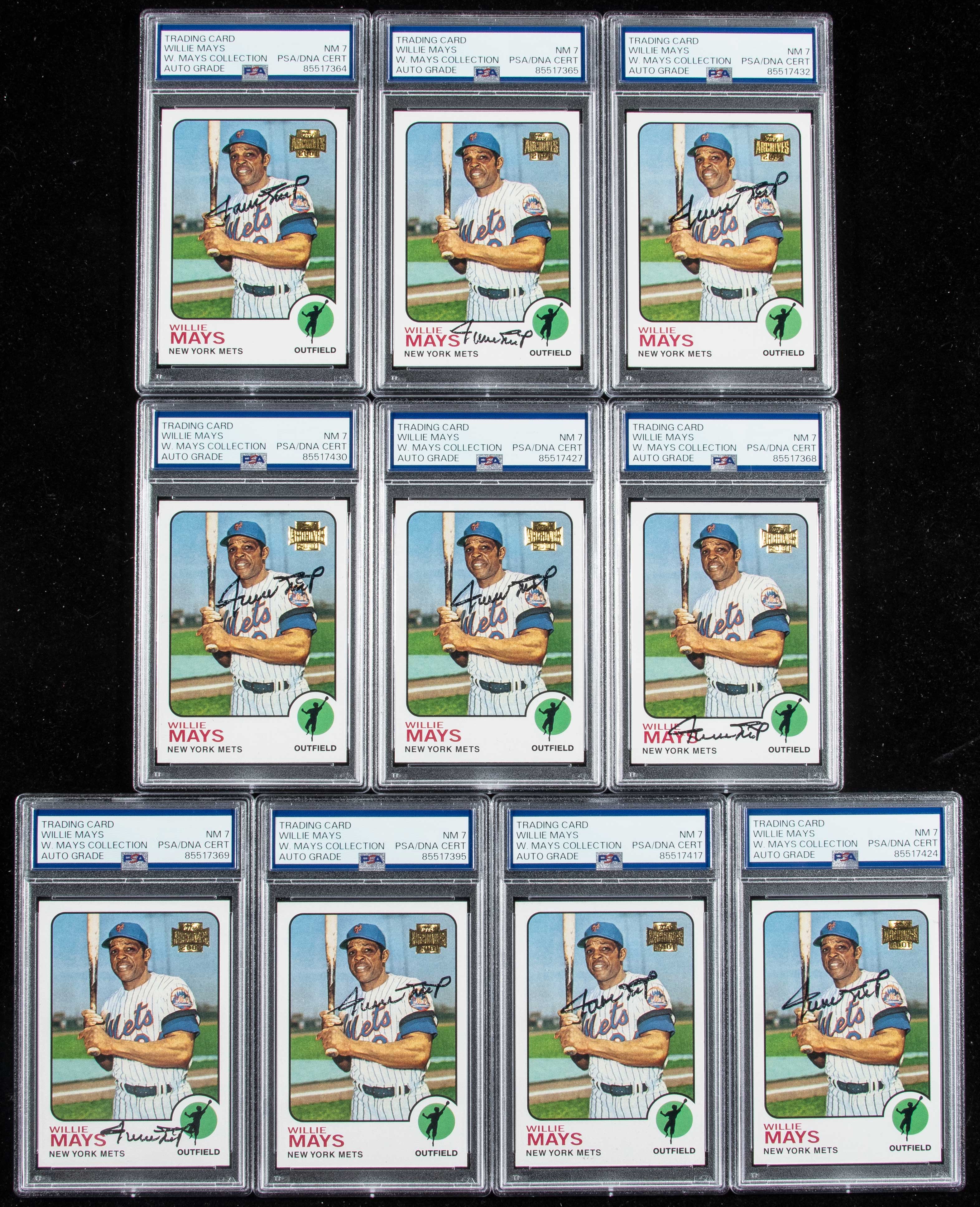Description:Lot of (10) 2001 Topps Archives Willie Mays autographed baseball cards (PSA/DNA 7 NM). Group of 2001 Topps Archives card #169 after the classic 1973 Topps card which was Mays final trading card from his playing career. Cards have been signed across the front in fine tip black marker rating 7 out of 10 due to varied 'spotting' to certain areas where the ink laid on the glossy surface. Encapsulated by PSA/DNA (7 NM) with special "W.Mays Collection" pedigree labeling: NM