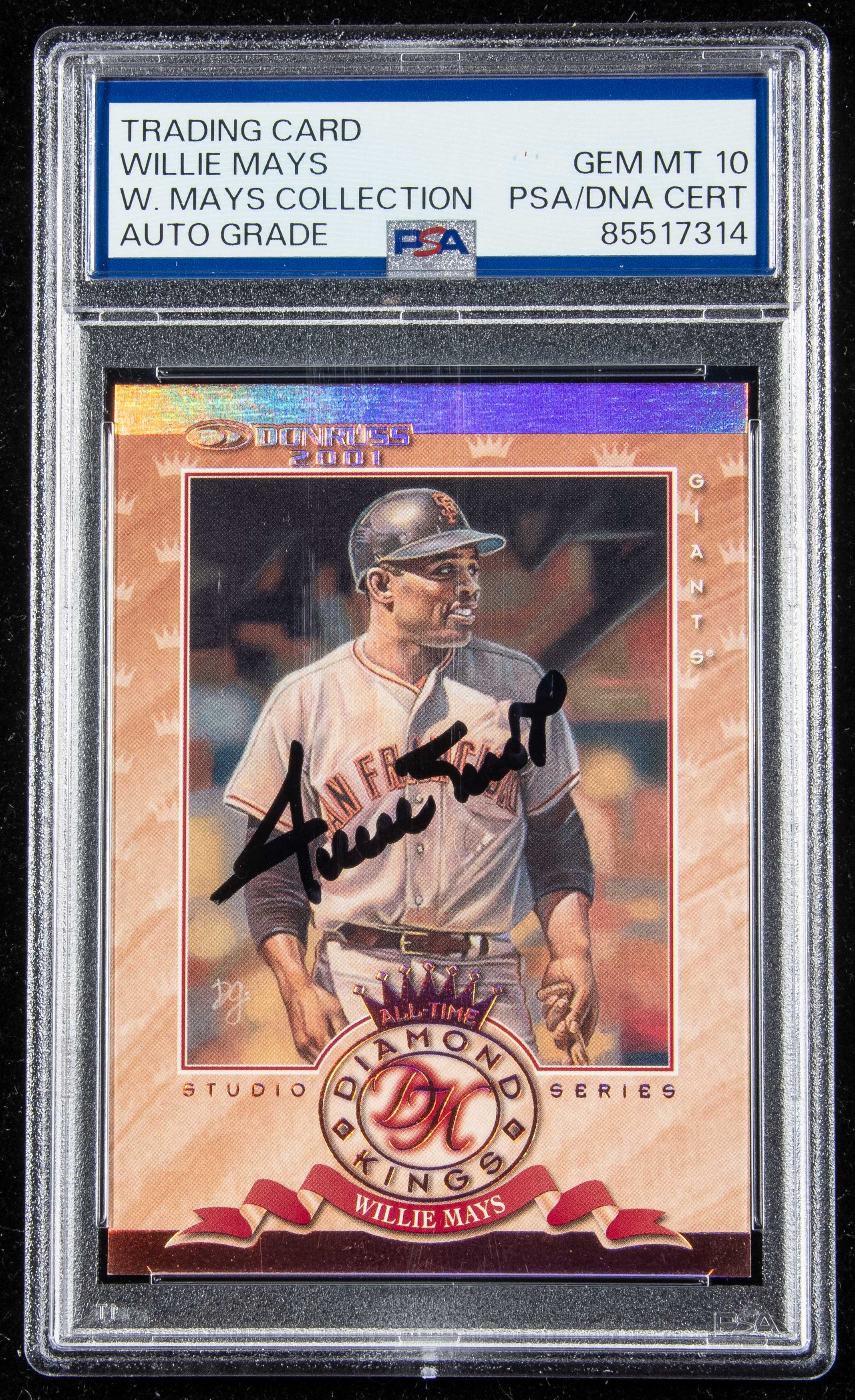 Description: 2001 Donruss Diamond Kings Willie Mays autographed baseball card (PSA/DNA 10 GEM MINT). Card # ATDK-1 from the 2001 Donruss issue having been signed by Mays across the front in black marker rating a flawless 10 out of 10. One of only a very small number of this particular signed card within the Mays Collection. Encapsulated by PSA/DNA (10 GEM MINT) with special "W.Mays Collection" pedigree labeling: GEM MINT