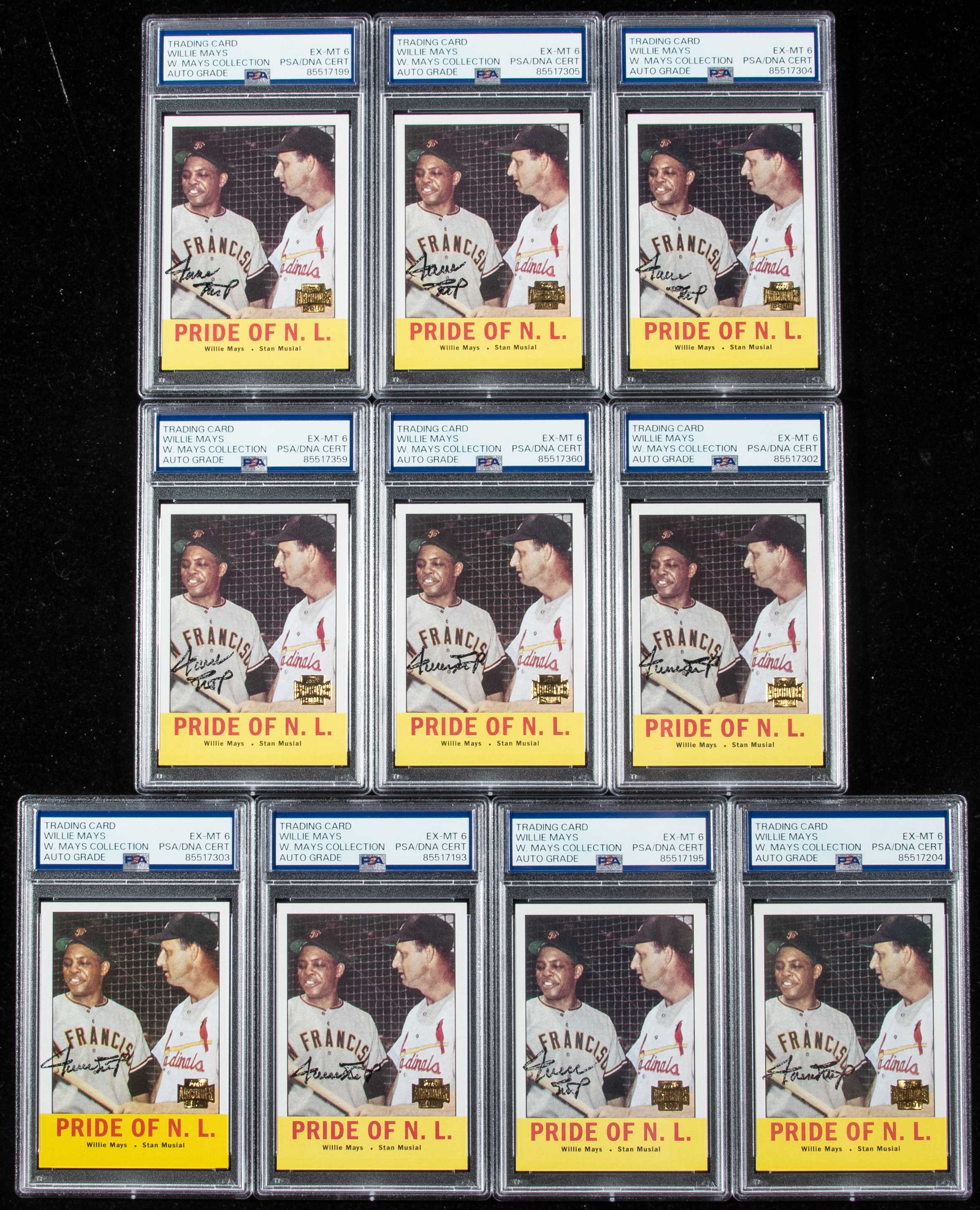 Description:Lot of (10) 2001 Topps Archives Willie Mays autographed baseball cards (PSA/DNA 6 EX-MT). Group of 2001 Topps Archives card #220 after the classic 1963 Topps card picturing Mays and Stan Musial. Cards have been signed across the front in fine tip black marker rating 6 out of 10 due to varied minor 'spotting' to certain areas where the ink laid on the glossy surface. Encapsulated by PSA/DNA (6 EX-MT) with special "W.Mays Collection" pedigree labeling: EX-MT