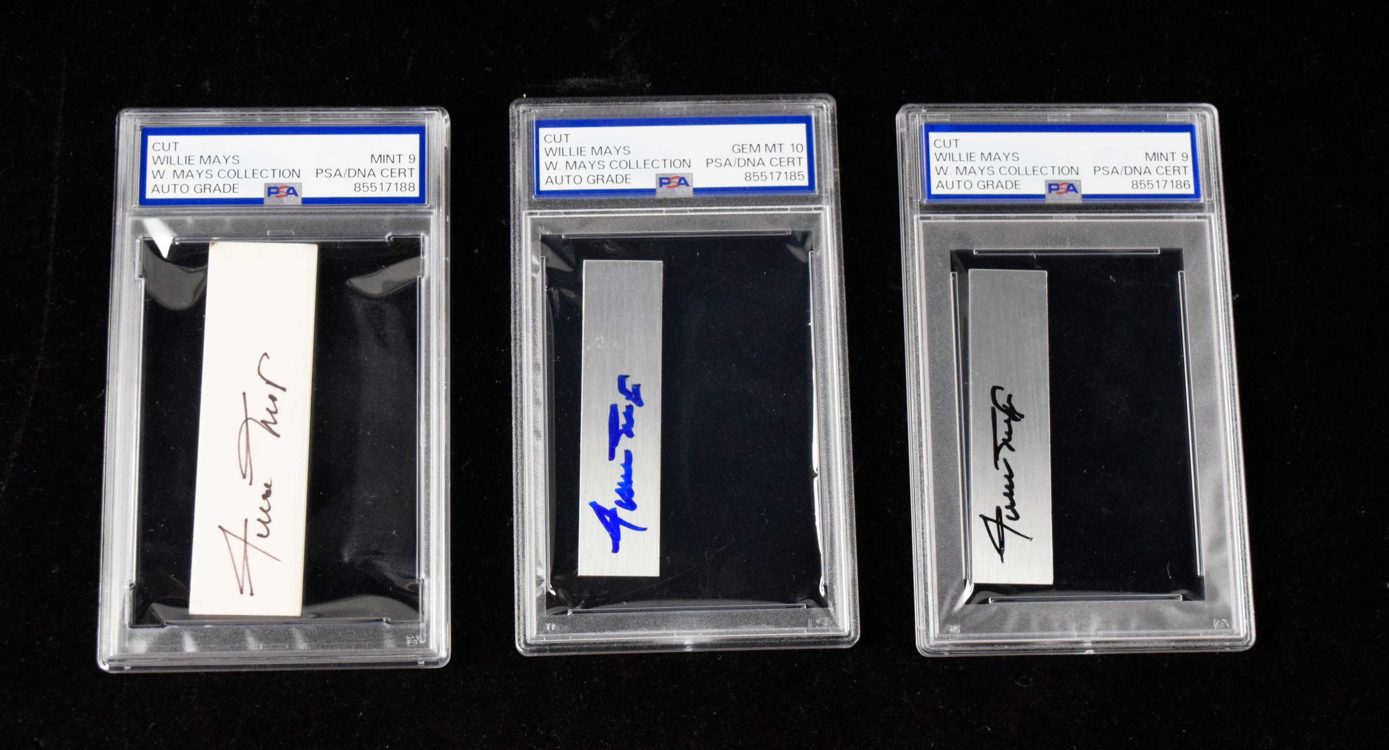 Description:Lot of (3) Willie Mays autographed cut signatures (PSA/DNA). Trio of Willie Mays signed cut items to include two metallic nameplates and one thick card stock. Blue and black marker autographs range from 9 to 10 out of 10. Each is encapsulated by PSA/DNA with two (9 MINT) and one (10 GEM MINT) all with special "W.Mays Collection" pedigree labeling: Range MINT to GEM MINT.