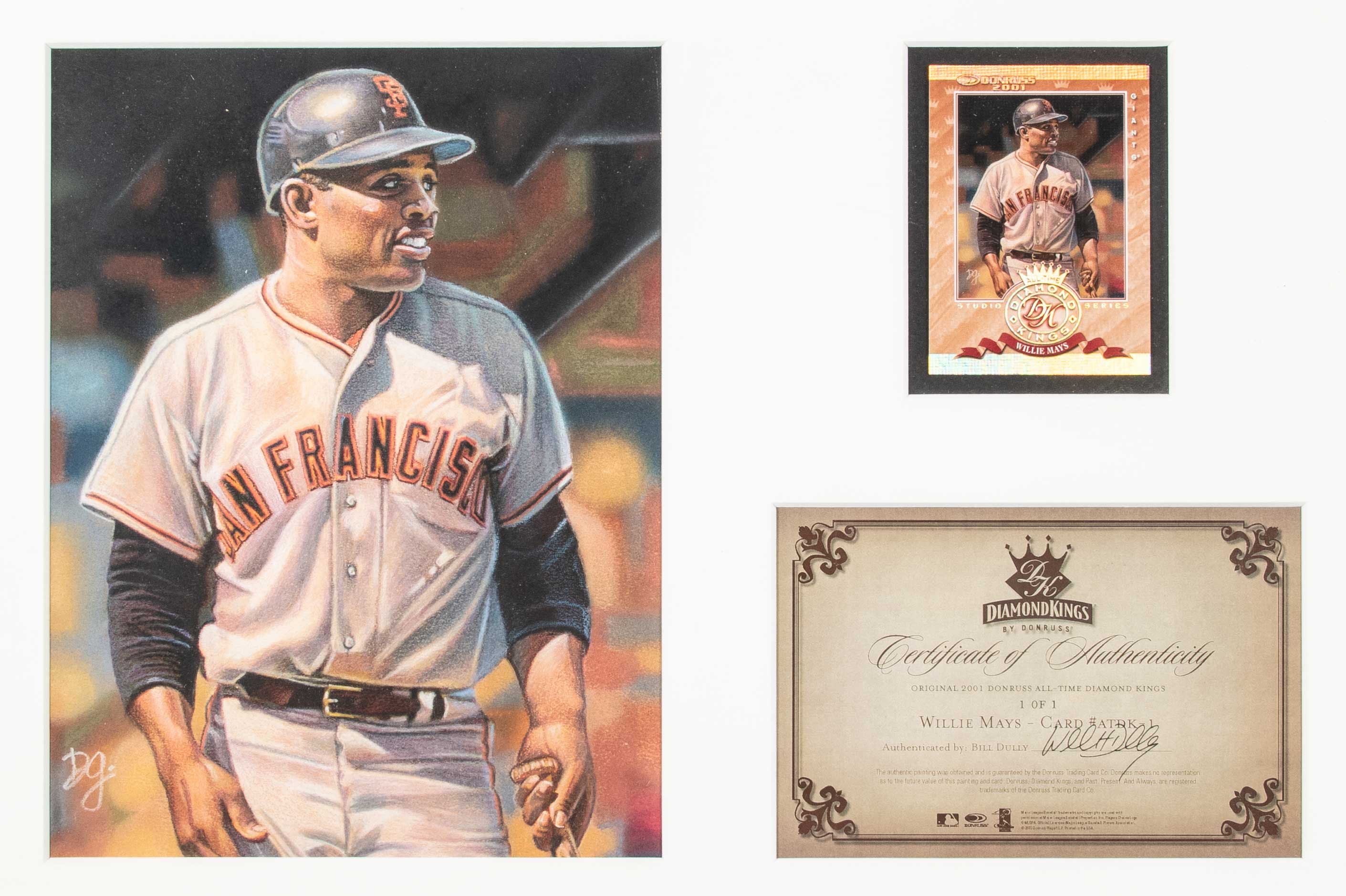 Description:2001 Willie Mays All-Time Diamond King Willie Mays 1 of 1 baseball card and original artwork. Matted and framed display containing Willie Mays 2001 All-Time Diamond Kings card #ATDK-1 along with original artwork as used for the card. Painting is signed by the artist and measures 7"x9". Certificate of authenticity from Donruss is framed within the display. Includes certificate of provenance from the Willie Mays Collection: NM-NM/MT