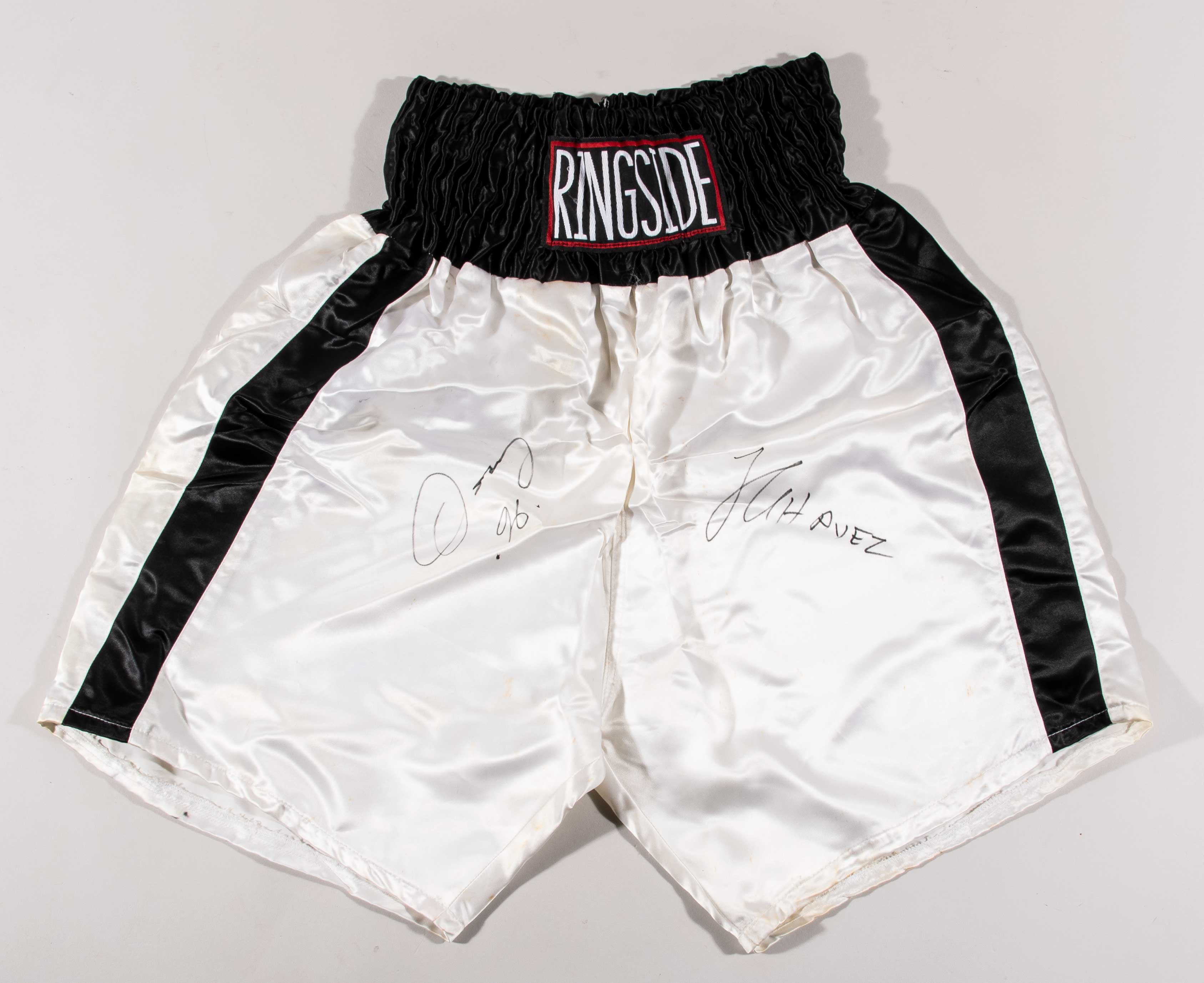 Description:Oscar De La Hoya and Julio Ceasar Chavez autographed boxing trunks. Pair of white satin Ringside brand boxing trunks have been signed by both former Champions in marker rating 7/8 out of 10. De La Hoya added the date, "96", and he had defeated Chavez that year to claim the WBC welterweight title. Minor staining/discoloration. Includes auction LOA from JSA and certificate of provenance from the Willie Mays Collection: EX-EX/MT