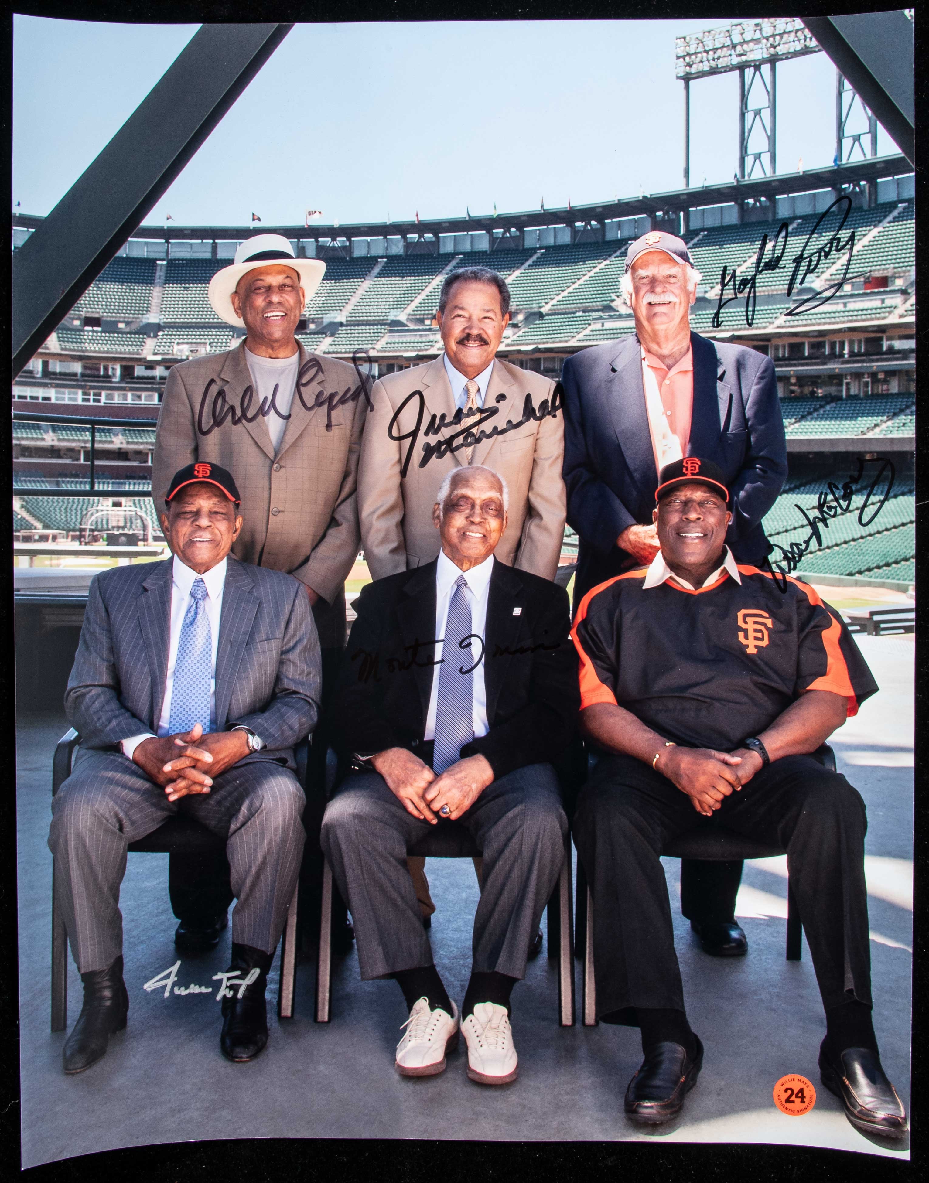 Description:New York and San Francisco Giants Hall of Fame Player autographed photograph. Color 16"x20" image of the five Giants players all of which are in the National Baseball Hall of Fame. Each player has signed their respective image to include W.Mays, M.Irvin, W.McCovey, G.Perry, J.Marichal, and O.Cepeda. Signatures range from 8-10 out of 10. Willie Mays 24 authentication label affixed and includes certificate of provenance from the Willie Mays Collection: NM-MT