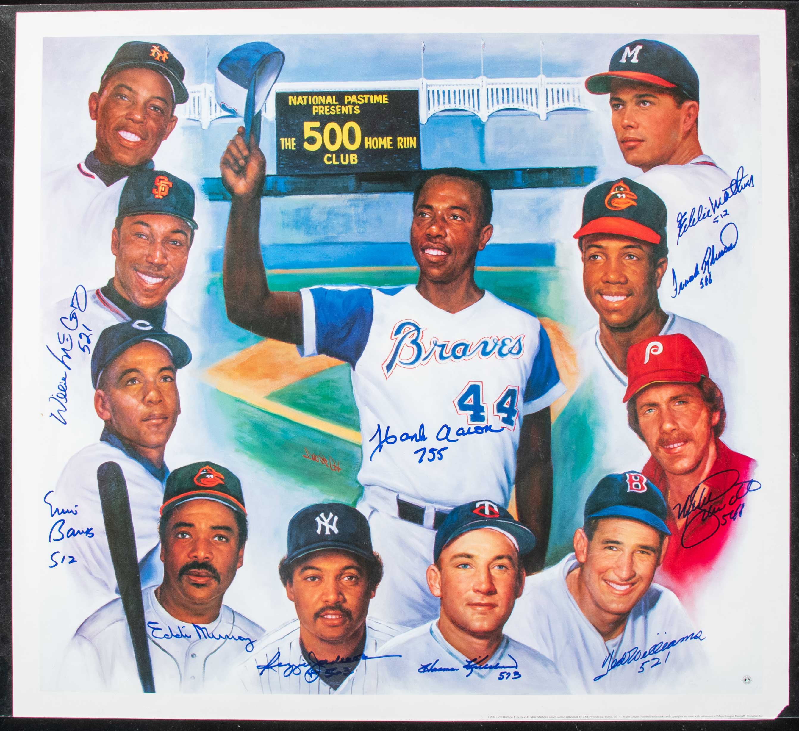 Description:500 Home Run Club autographed poster from the Willie Mays Collection. Large format (27"x29.5") poster showing members of the exclusive 500 Home Run Club has been signed by Hank Aaron, Ted Williams, Willie McCovey, Ernie Banks, Eddie Murray, Reggie Jackson, Harmon Killebrew, Mike Schmidt, Frank Robinson, and Eddie Mathews. All but Murray have inscribed their career home run total. Marker signatures rate 8/9 out of 10 or better. Some minor wear (including a small tear in lower edge) could largely be covered when matted and framed for display. Includes auction LOA from JSA and certificate or provenance from the Willie Mays Collection: Sigs NM, Print VG