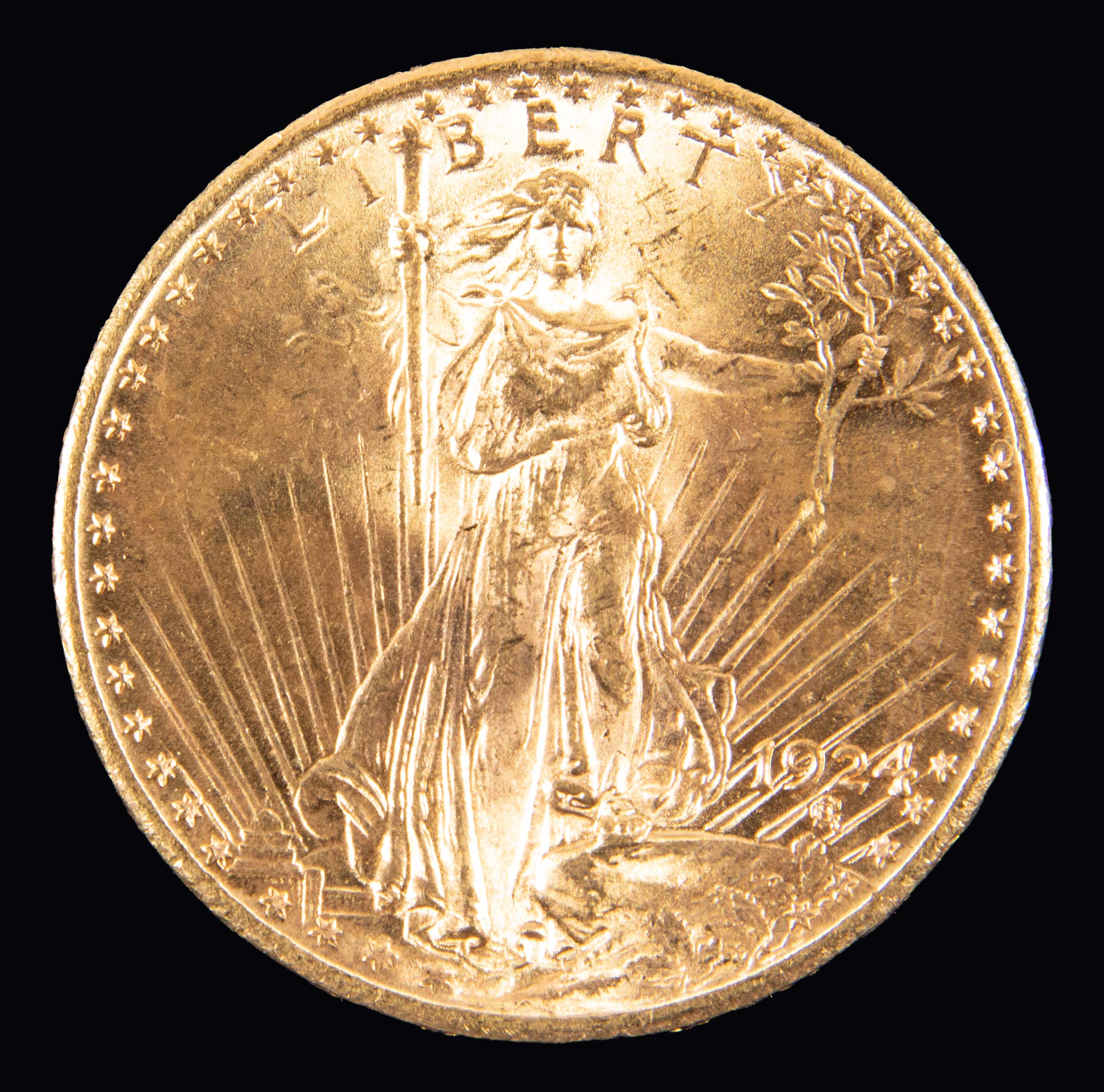 1924 $20 St. Gaudens Gold Double Eagle from the Willie Mays Collection. Gold coin is one of the most celebrated designs ever minted. Touch of light wear. Includes certificate of provenance from the Willie Mays Collection: VG-EX