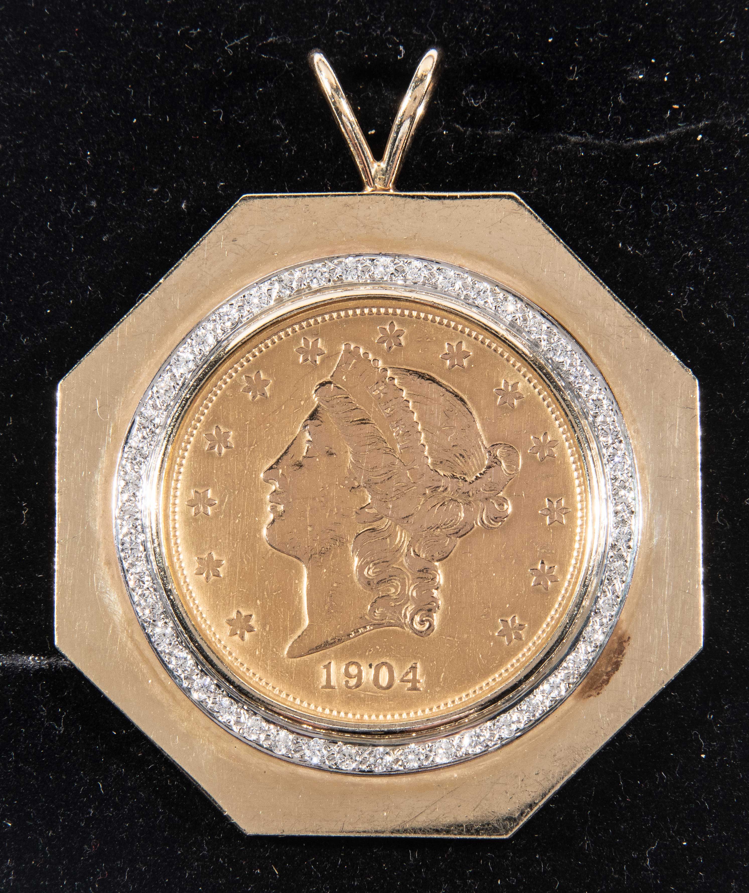 Description:1904 U.S. Gold Coin with diamond setting gold pendant from the Willie Mays Collection. Desirable 1904-S United States $20 Liberty Head gold fashioned into a pendant having a perimeter of inset diamonds within an octagon shaped 14K gold setting. Willie Mays is frequently photographed having worn similar necklaces including during his playing career. Light general surface wear with the mount stamped 14K. Includes certificate of provenance from the Willie Mays Collection: EX-MT