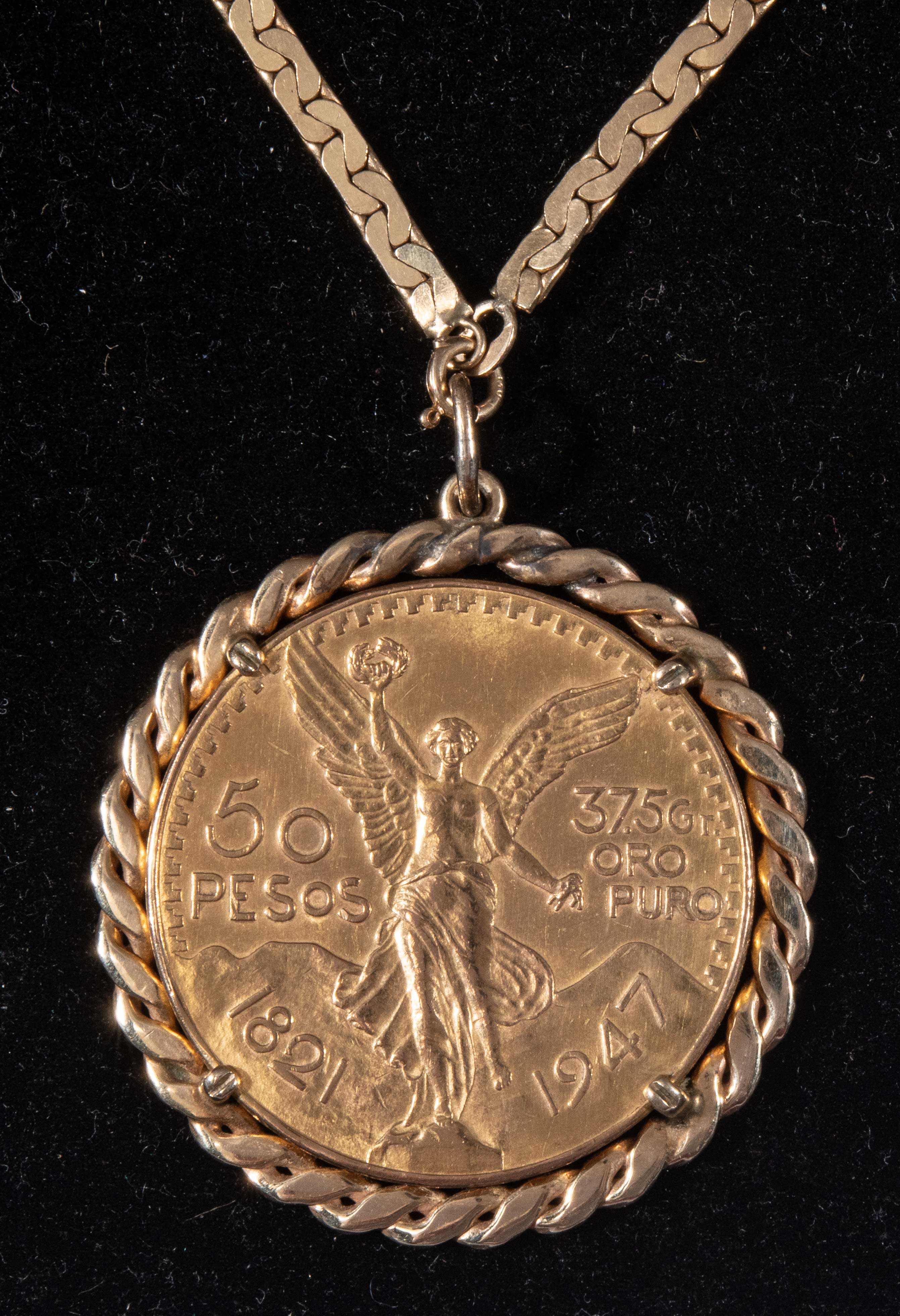 Description:1947 50 Pesos gold coin with necklace from the Willie Mays Collection. Desirable Mexican gold coin which has been customized within a gold mount and 14K gold chain. Coin itself is positioned with small prongs and could be easily removed if so desired. Total weight of 2.3 ounces. Includes certificate of provenance from the Willie Mays Collection: NM