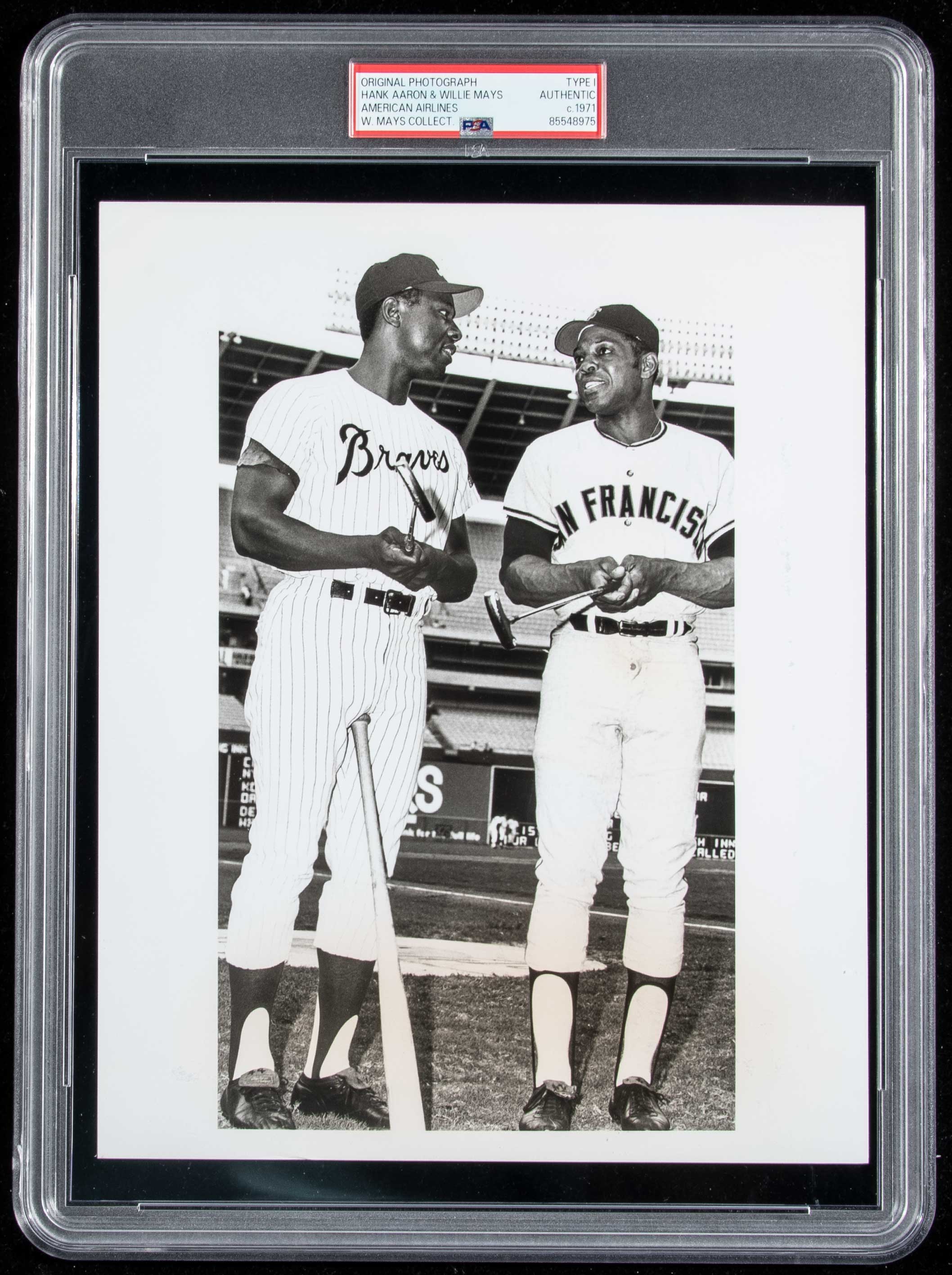 Description:Willie Mays and Hank Aaron photograph c.1971 (PSA/DNA Type I). Black and white 8"x10" image of the two sluggers posed in full uniform holding golf clubs in a promotional photograph for the American Airlines Golf Tournament. Very strong contrast with the back retaining its original paper identification labeling. Encapsulated by PSA/DNA (Type I) with special "W.Mays Collection" pedigree labeling: NM