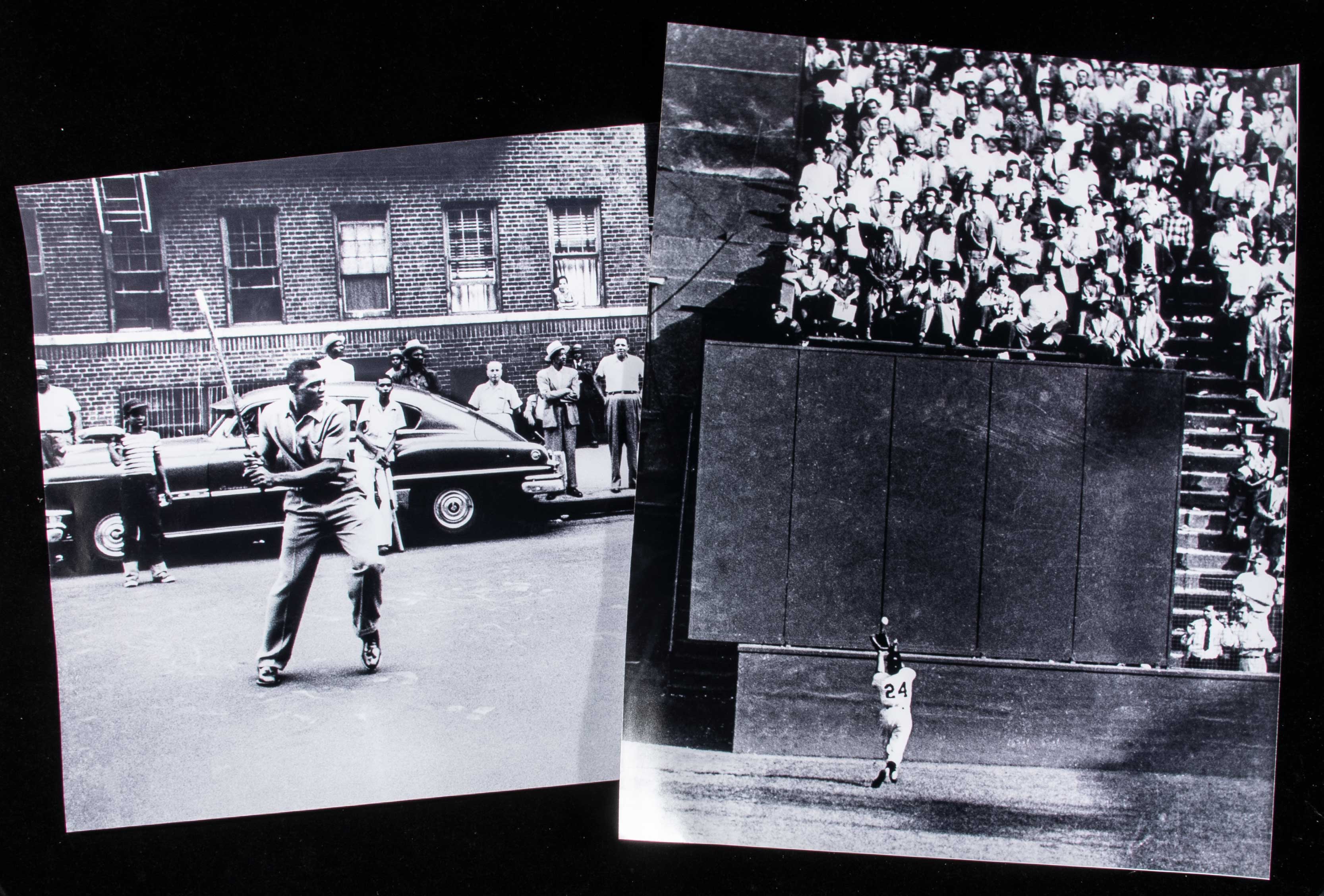 Description:Pair of large format Willie Mays related photographs. Two modern era 24"x30" black and white photographic renderings depicting two of Willie Mays' iconic career moments: 1) 1954 World Series "The Catch" and Mays playing stickball with a group of young boys in Harlem. Each is unframed and would make for very impressive displays. Includes certificate of provenance from the Willie Mays Collection: NM