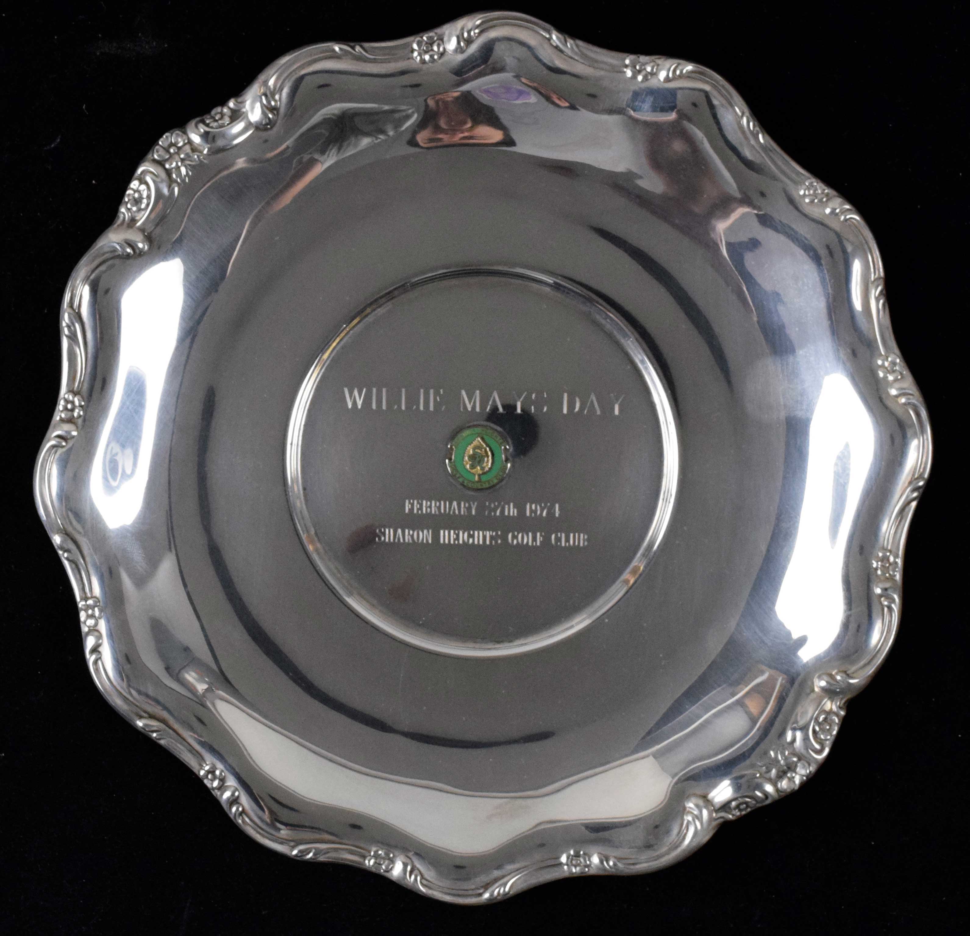 Description:1974 Willie Mays Sharon Hills Golf Club sterling silver award plate. Sterling silver presentational plate engraved to Willie Mays with the Sharon Hill Golf Club insignia embossed at center Marked with Reed & Barton hallmark on the back along with "Sterling Silver" having a total weight of 10.7 ounces. 10" diameter. Includes certificate of provenance from the Willie Mays Collection: EX