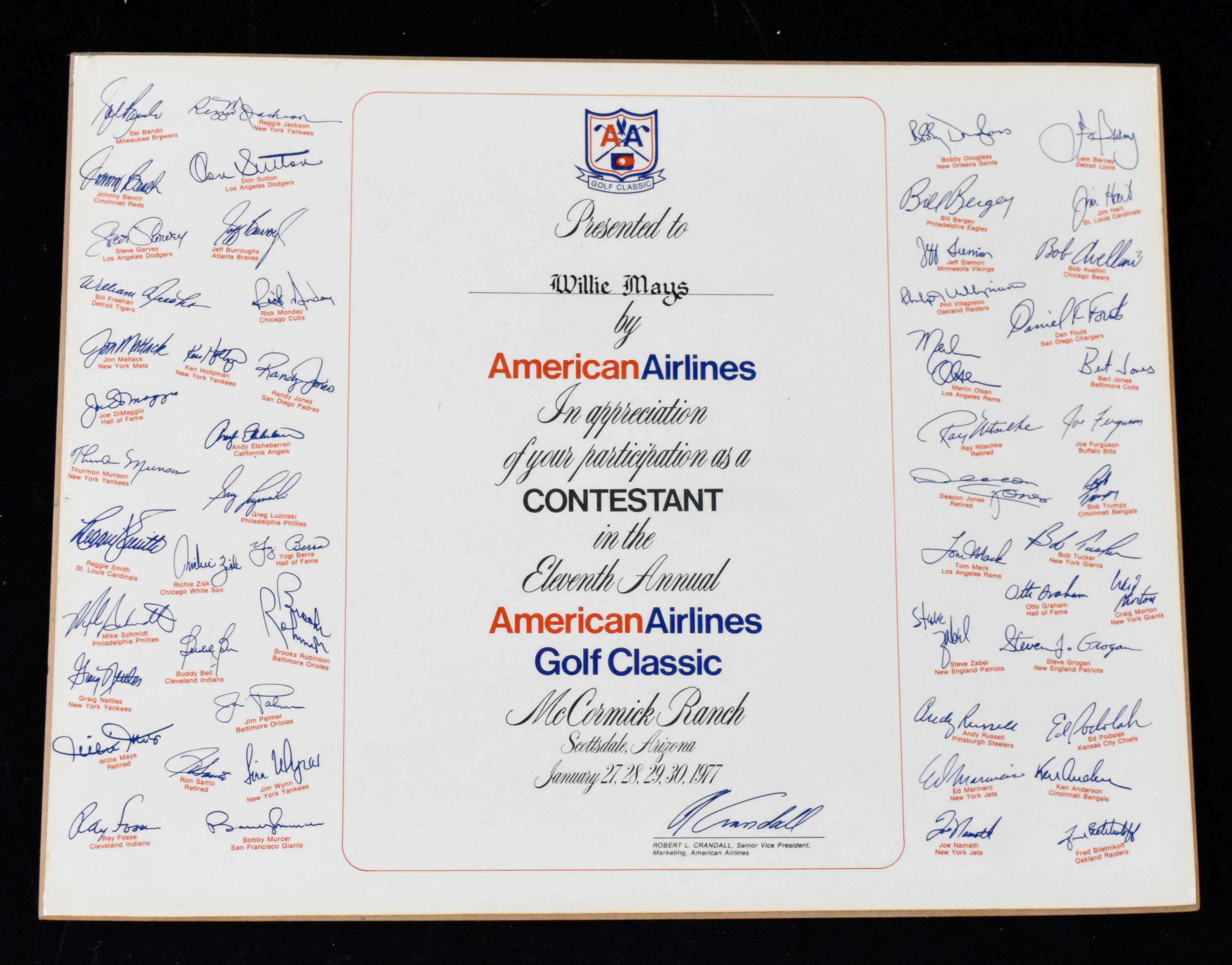 Description:1977 Willie Mays American Airlines Golf Tournament display piece. Fiberboard 14"x18" display given to Willie Mays as a participant in the 1977 American Airlines Golf Tournament having facsimile signatures of the participating celebrities. Includes certificate of provenance from the Willie Mays Collection: EX