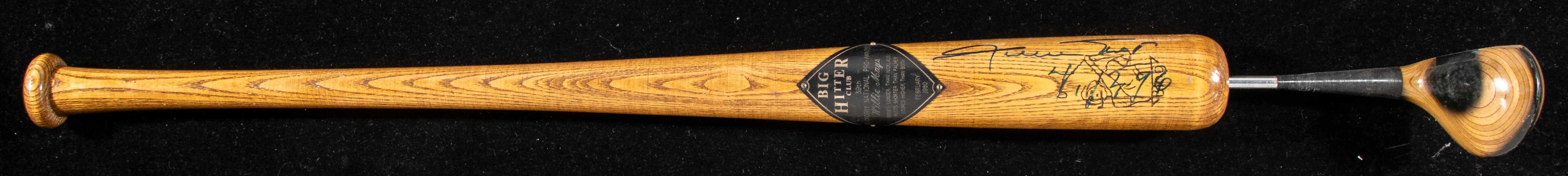 Description:Willie Mays autographed "Big Hitter Club" Baseball Bat presentational golf club. Full size baseball bat shaped golf club driver with applied placard inscribed and dated 1980 and presented to Mays at the Bing Croby Pro Am. Signed by Mays in blue sharpie on the barrel adding 1996 date beneath. 40" long with minimal wear. Includes auction LOA from JSA (autograph) and certificate of provenance from the Willie Mays Collection: NM-MT