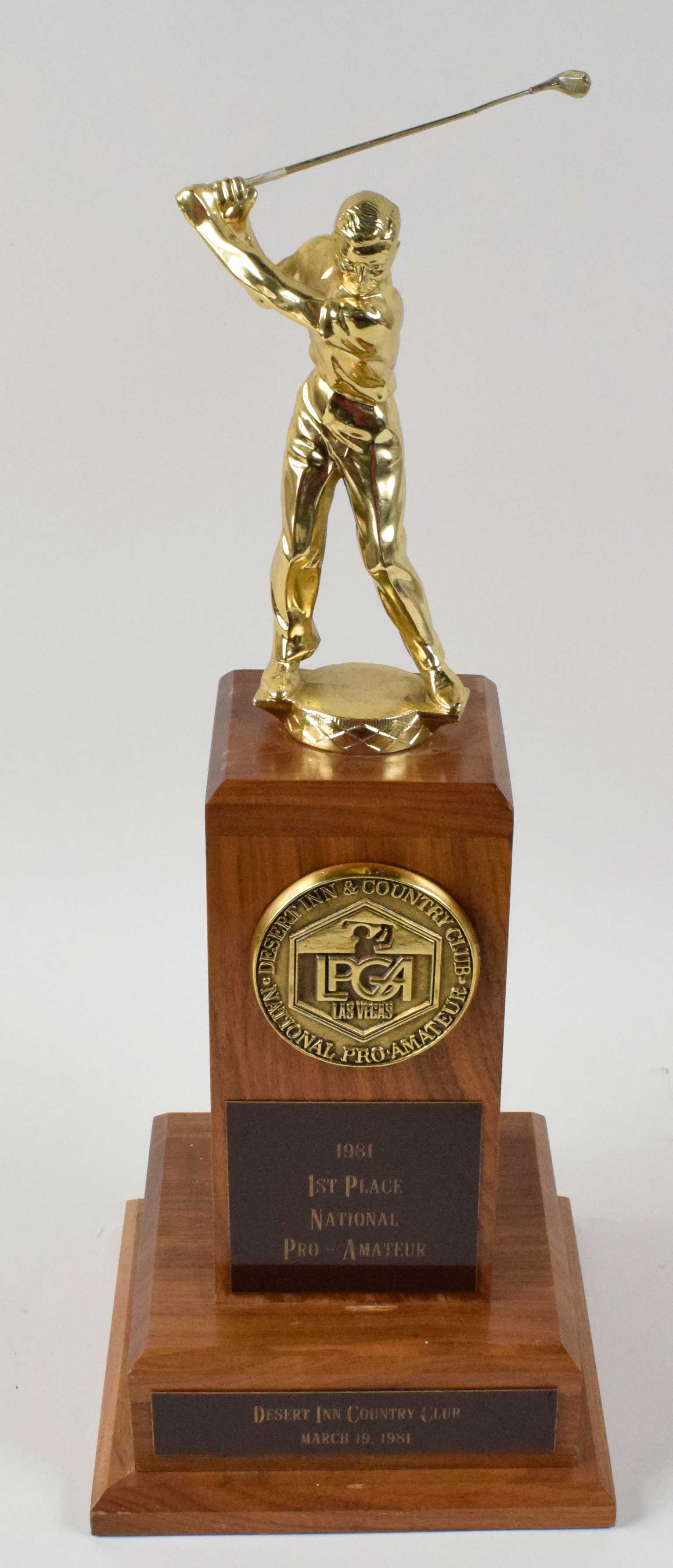 Description:1981 Willie Mays Desert Inn LPGA Pro-Amateur Golf trophy. Large figural trophy presented to Willie Mays and his partner for capturing the 1981 Desert Inn Pro-Am title. Walnut wooden plinth style base with central column supporting brass figural golfer and applied brass medallion. 22" tall with light general wear. Includes certificate of provenance from the Willie Mays Collection: EX
