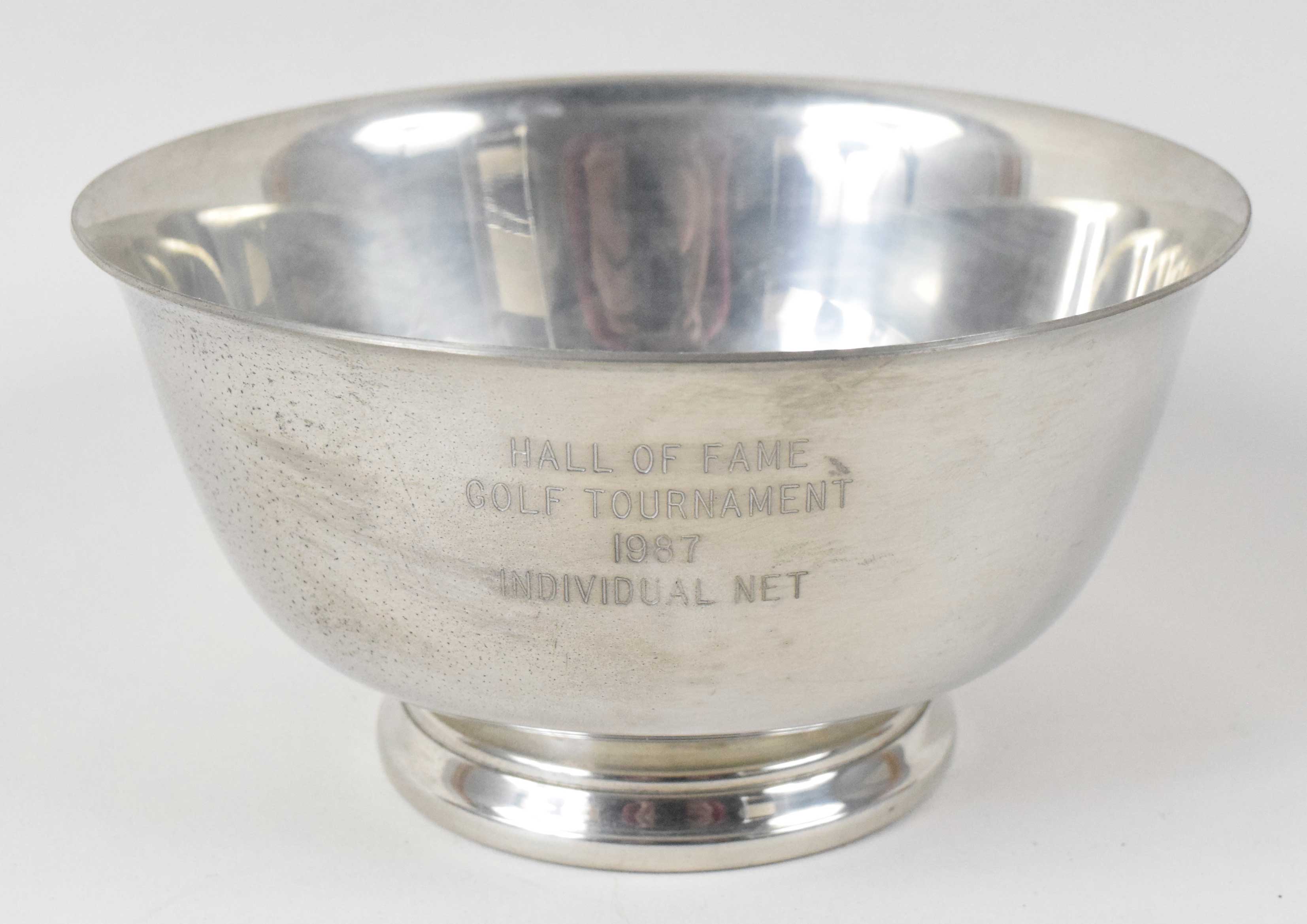 Description:1987 Willie Mays Hall of Fame Golf award. Silverplated pewter blow as won by Mays during the 1987 Hall of Fame golf tournament. Award titling engraved on front and marked with Balfour hallmark under the bowl. 6" diameter. Includes certificate of provenance from the Willie Mays Collection: EX