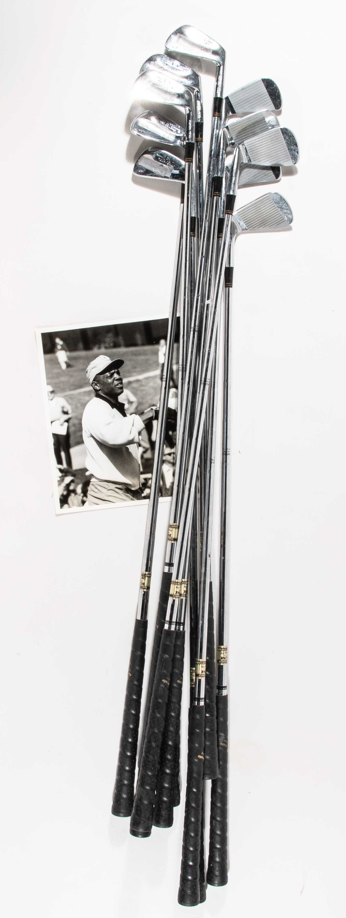Description:Willie Mays golf club set c.1970-80s. Set of Ram FX model golf clubs as used by Willie Mays. Includes irons only with moderate evident use. Vintage 8"x10" photo of Mays in golf setting accompanies the club set. Includes certificate of provenance from the Willie Mays Collection: VG-EX