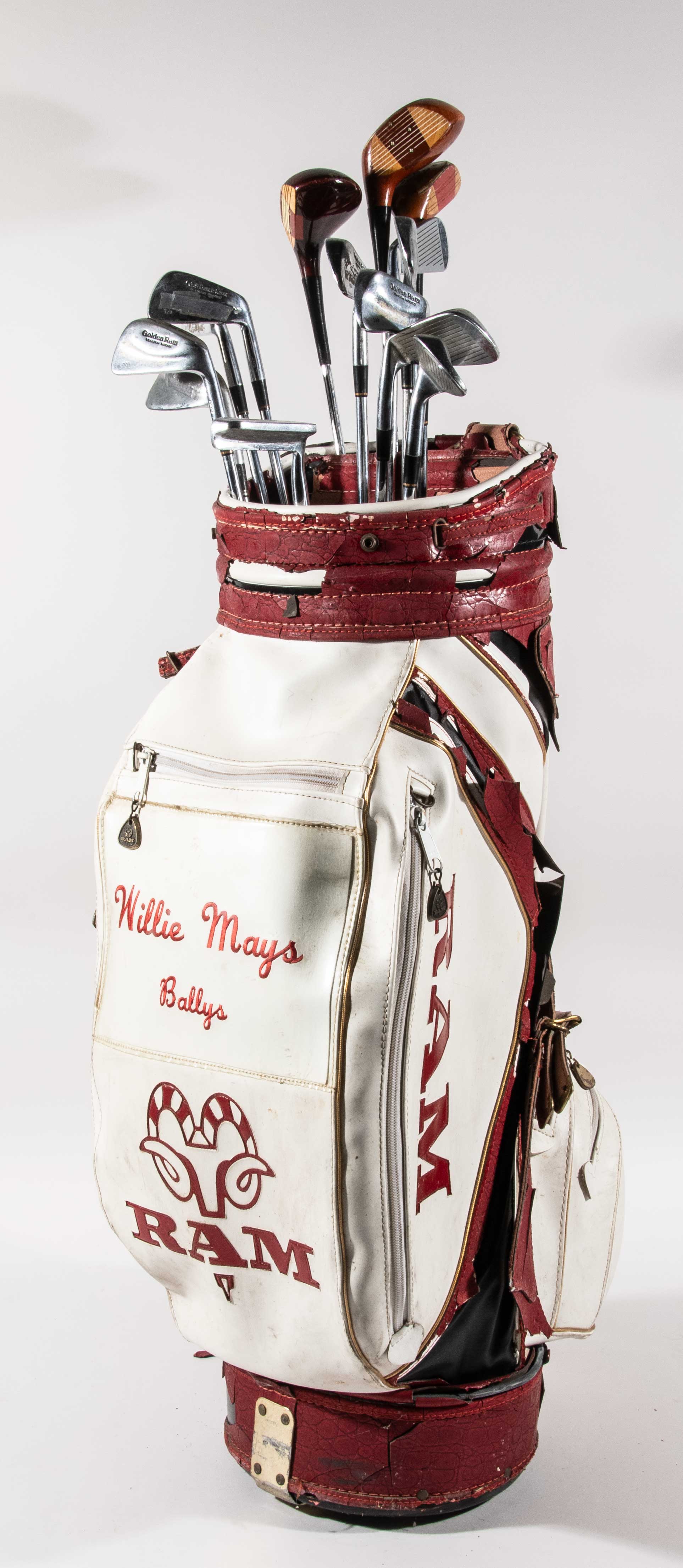 Description:Willie Mays golf clubs with personalized bag c.1970-80s. Golden Ram model clubs along with MacGregor model drivers as used by Willie Mays presented in a red and white Ram model golf bag. Bag has "Willie Mays Bally's" embroidered on side pocket. Clubs show light to moderate use with the bag having a few areas of damage to the exterior. Includes certificate of provenance from the Willie Mays Collection: VG-EX