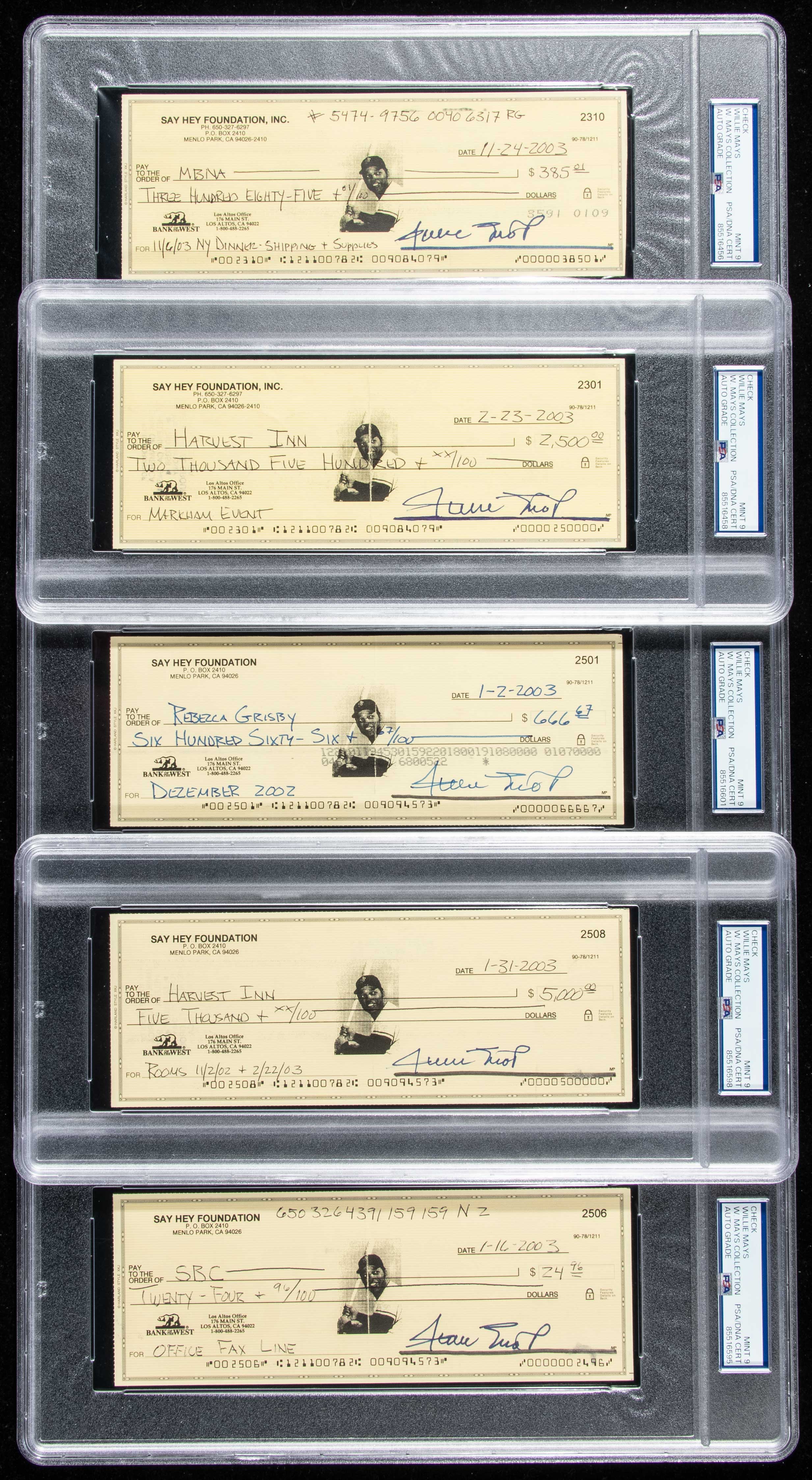 Description:Lot of (10) Willie Mays autographed checks (PSA/DNA 9 Mint). Nice lot of 2003 dated checks, each signed "Willie Mays" at lower right. All autographs are graded "9 Mint" by PSA and there are varying degrees of typical handling and bank cancellation wear (a touch more pronounced in some cases). Each is authenticated and encapsulated by PSA with "W.Mays Collection" noted on the label: Mint