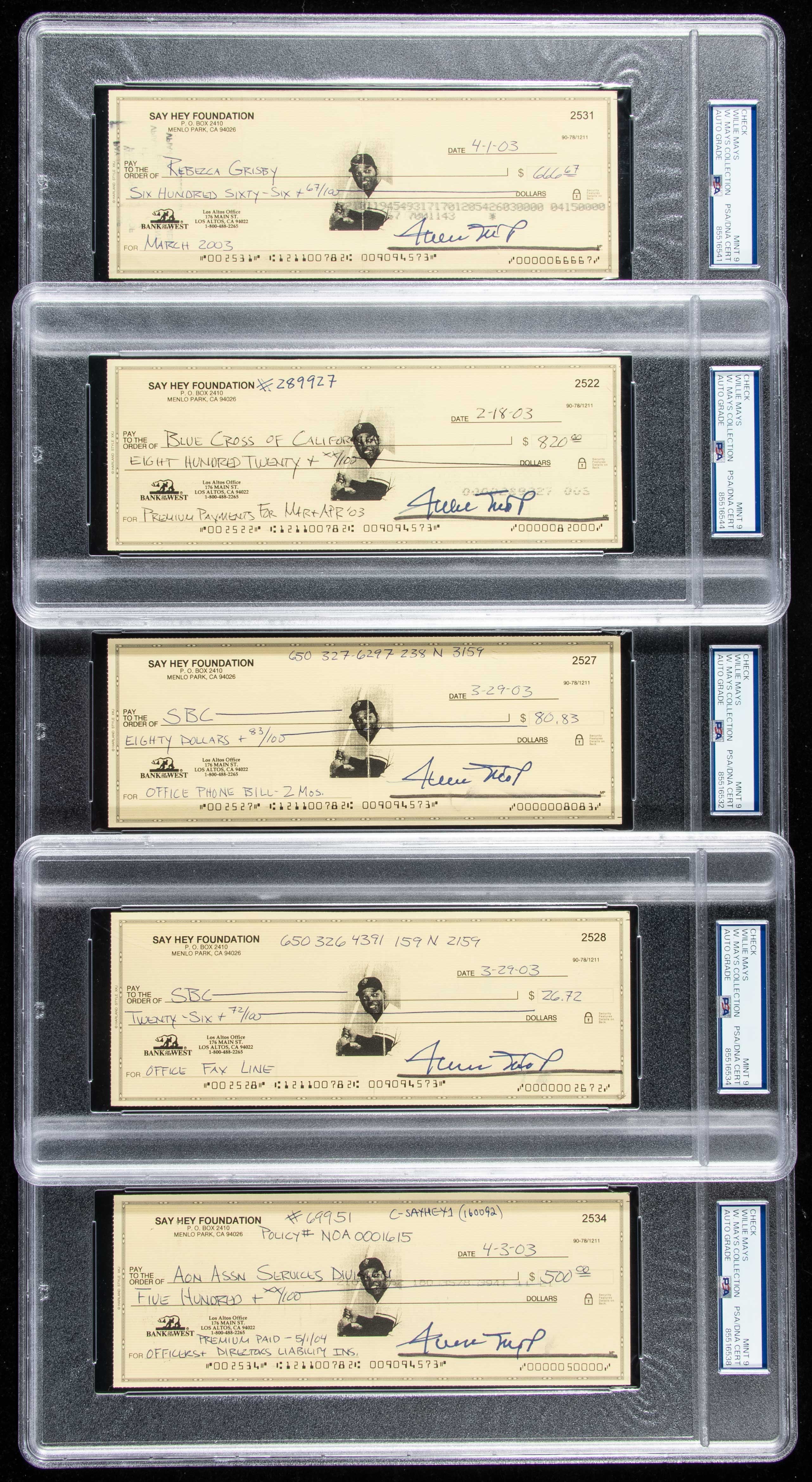 Description: Lot of (5) Willie Mays autographed checks (PSA/DNA 9 Mint). Nice lot of 2003 dated checks, each signed "Willie Mays" at lower right. All autographs are graded "9 Mint" by PSA and there are varying degrees of typical handling and bank cancellation wear (a touch more pronounced in some cases). Each is authenticated and encapsulated by PSA with "W.Mays Collection" noted on the label: Mint