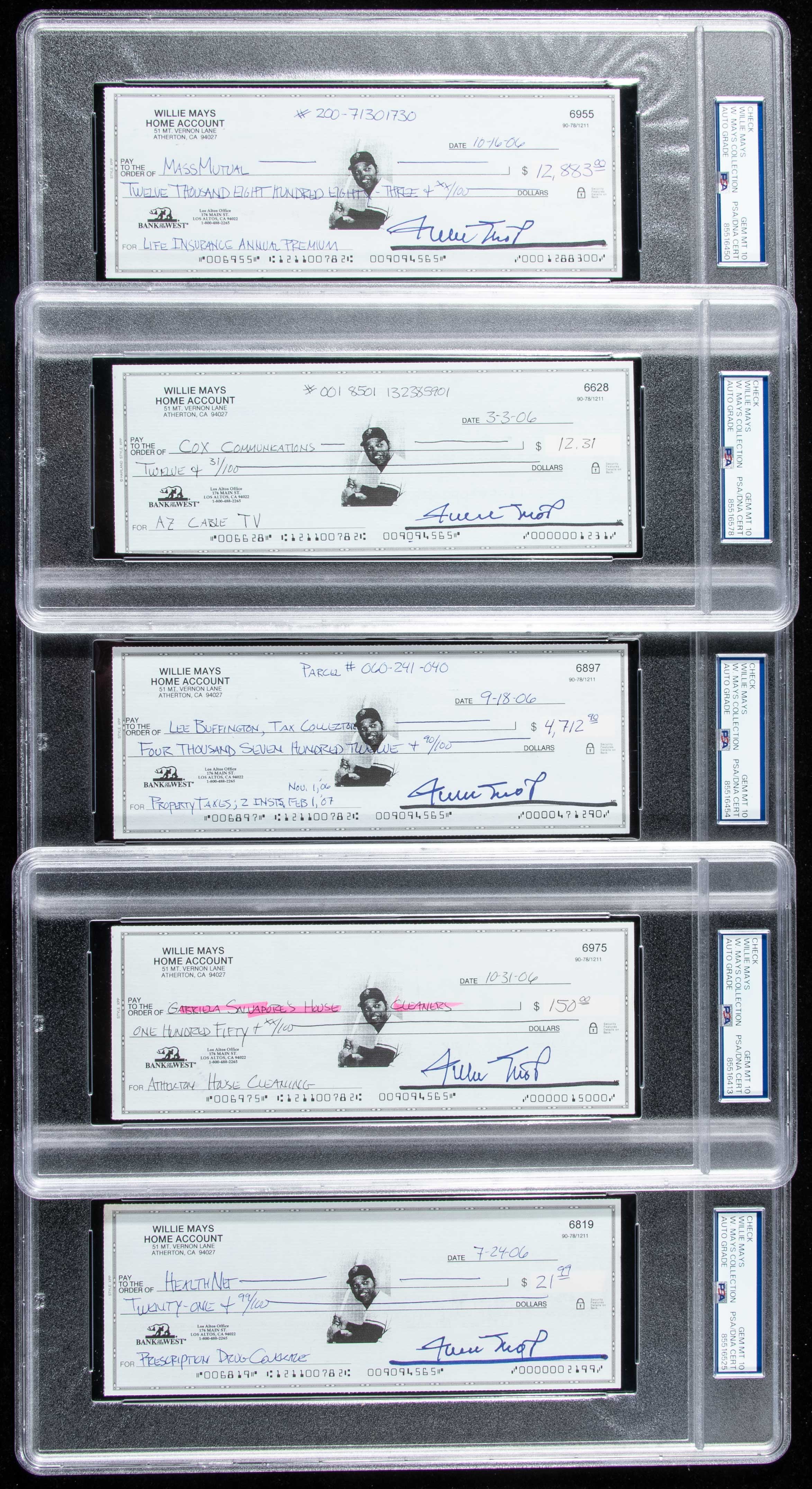 Description: Lot of (10) Willie Mays autographed checks (PSA/DNA 10 Gem Mint). Nice lot of 2006 dated checks, each signed "Willie Mays" at lower right. All autographs are graded "10 Gem Mint" by PSA and there are varying degrees of typical handling and bank cancellation wear (a touch more pronounced in some cases). Each is authenticated and encapsulated by PSA with "W.Mays Collection" noted on the label: Gem Mint