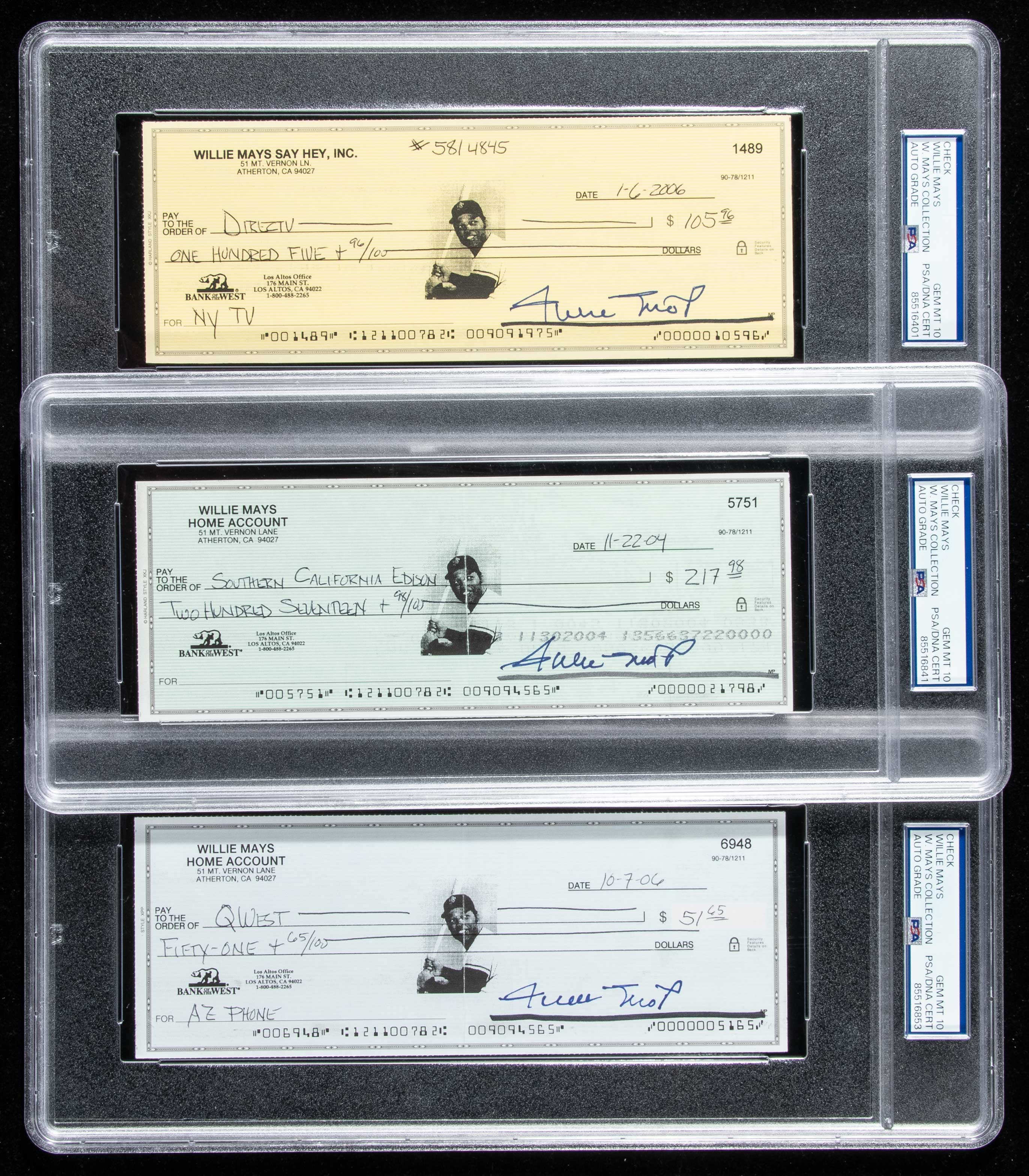 Description:Lot of (3) Willie Mays autographed checks (PSA/DNA 10 Gem Mint). Nice lot of differing styles, each signed "Willie Mays" at lower right. All autographs are graded "10 Gem Mint" by PSA and there are varying degrees of typical handling and bank cancellation wear (a touch more pronounced in some cases). Each is authenticated and encapsulated by PSA with "W.Mays Collection" noted on the label: Gem Mint