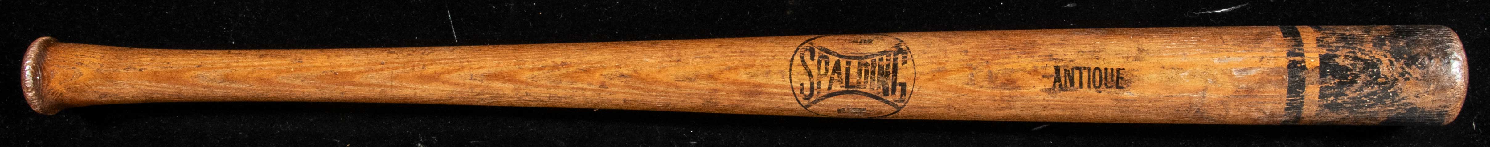 Spalding "Antique" ring decorated baseball bat c.1880s-90s. 34" bat with Spalding logo at the center, "ANTIQUE" stamped to the right, and black painted ring at the end. Used, with spots of paint loss including the model number: G/VG-VG