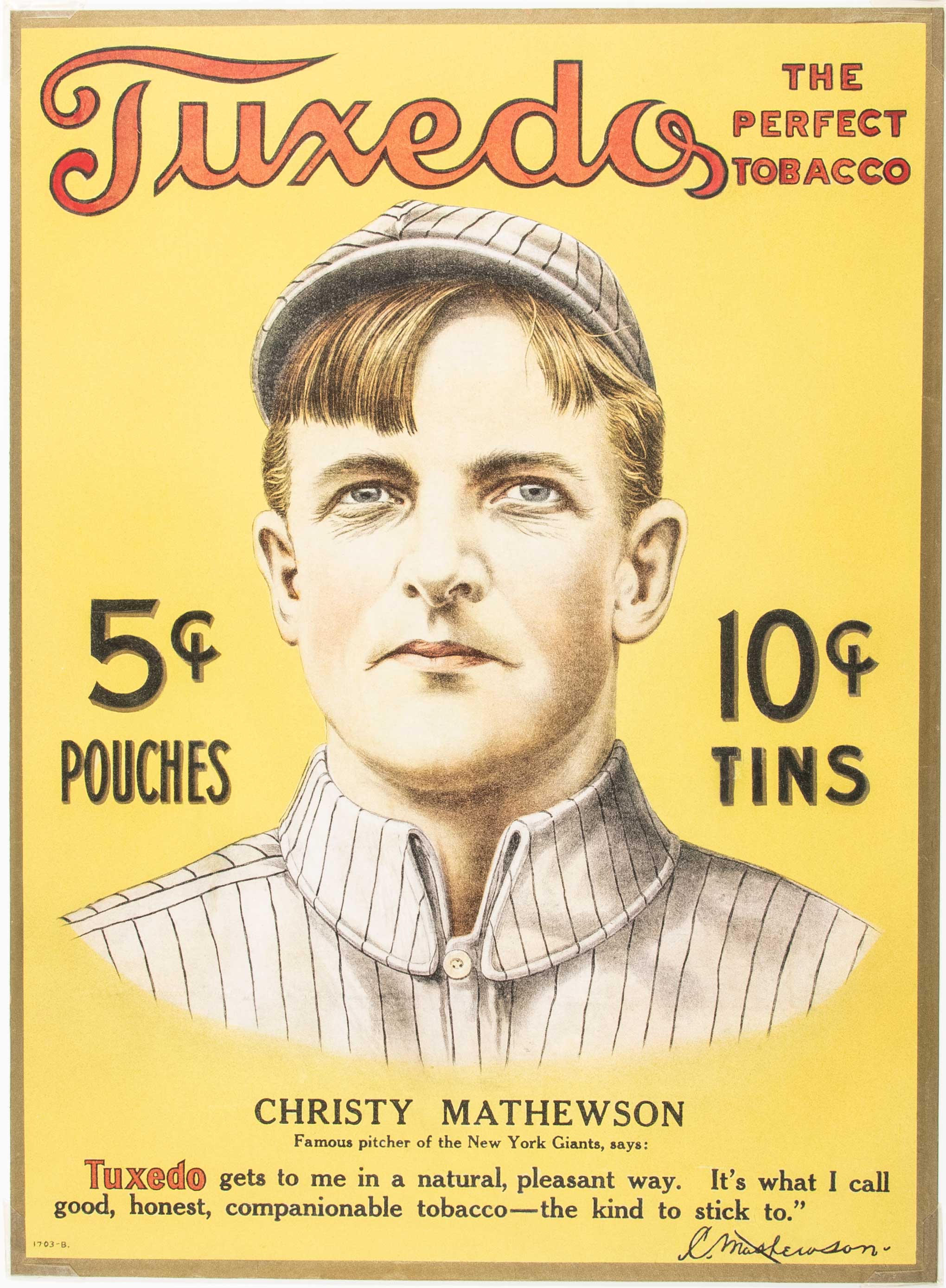 Description:Magnificent Christy Mathewson Tuxedo Tobacco advertising display c.1910. Stunning large format piece ranks among the most visually appealing baseball related advertising displays ever created. A large portrait likeness of Matty appears at the center with "Tuxedo" titling above. His endorsement runs along the bottom and is completed by a facsimile signature. Displays at EX/MT or better level with a few overt flaws visible upon close examination. It has been restored to this level of appearance with the highest quality of workmanship that we have seen and presumably at great expense. This work was done in what appears to be a few isolated areas with the bulk of the piece original as issued. Measures just under 14"x19" and comes housed in 18.25"x23.25" frame for display: Displays EX-MT with note to restoration