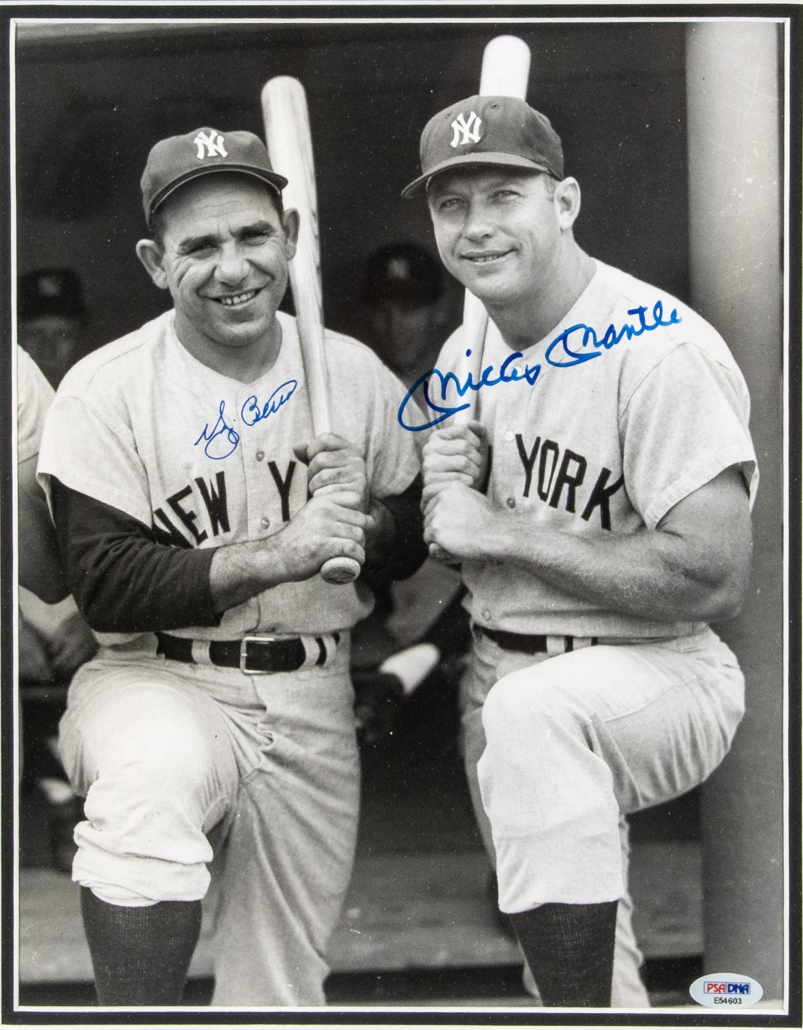 Mickey Mantle and Yogi Berra autographed 11"x14" photograph. Outstanding black and white image has been signed by both Mantle and Berra in marker rating 9-9/10 out of 10. Framed to 18"x21" for display. Includes full LOA from PSA/DNA: NM