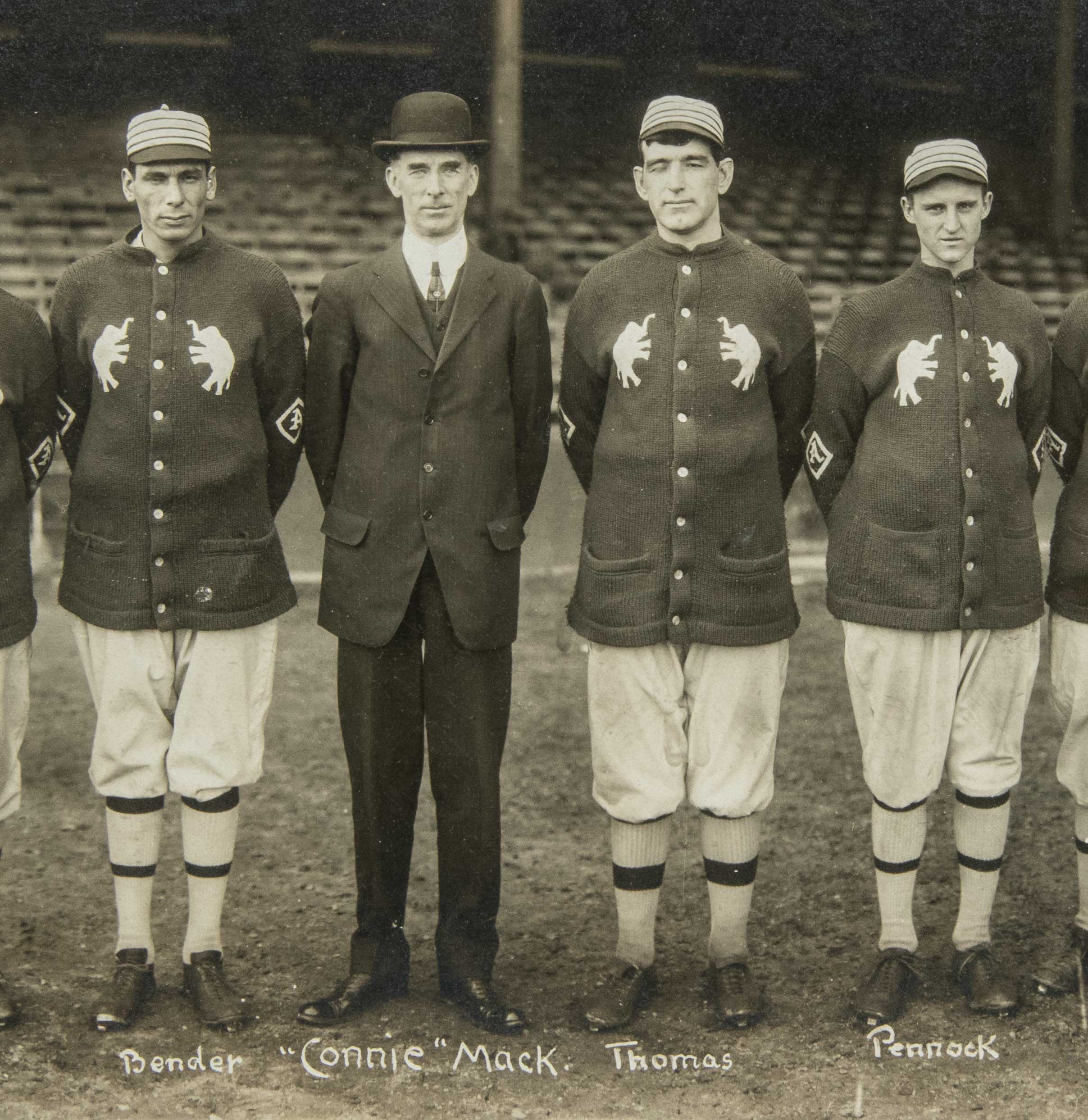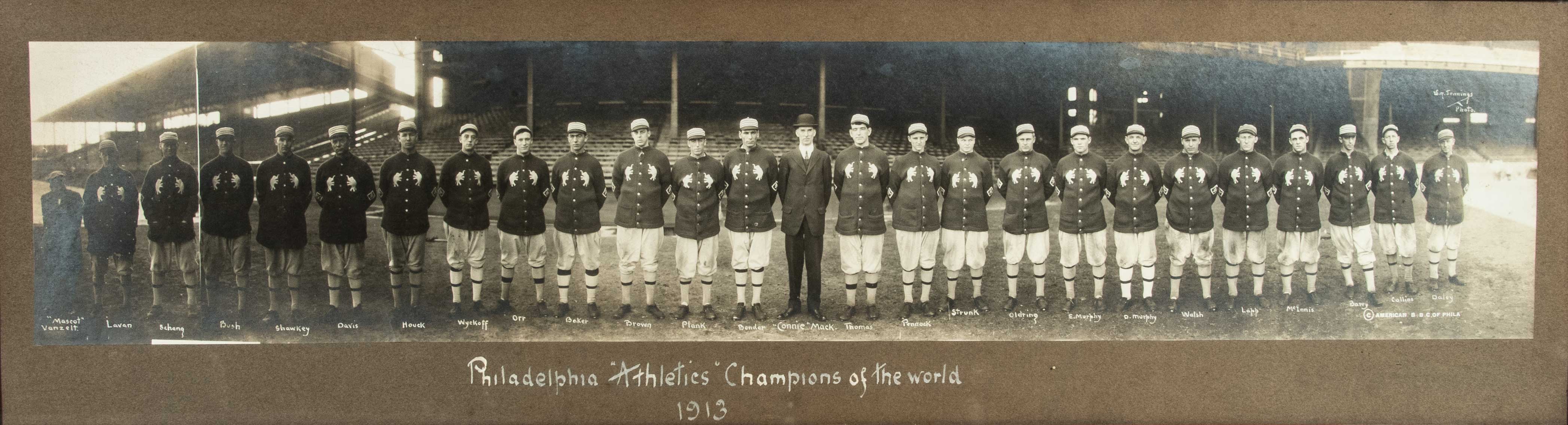 Description:Magnificent 1913 Philadelphia Athletics panoramic photograph presented to Rube Oldring - World Series Champions. Visually arresting original black and white photograph of the World Series Champion Athletics posed in full uniform, including their unique double elephant insignia sweaters, inside Shibe Park. Players are identified in white lettering below their respective likenesses including Eddie Plank, Frank Baker, Chief Bender, Connie Mack, Herb Pennock, and Eddie Collins. Overall composition is exceptional with crystal clear clarity and crisp registration offering art like qualities. Affixed to its' original mount which has "Philadelphia Athletics Champions of the World" hand calligraphed below. "Jennings" studio mark is printed within and the piece is housed in a period 15.5"x46.5" frame for display. Light silvering a touch of natural age/wear. Originally offered by Leland's in 2019 along with other pieces from the Estate of player Rube Oldring however the letter of provenance has been misplaced (a letter on Hunt Auctions stationary will be furnished to confirm history). One of the finest early baseball team photographs and notably rare with this being only the second example we can recall offering: EX