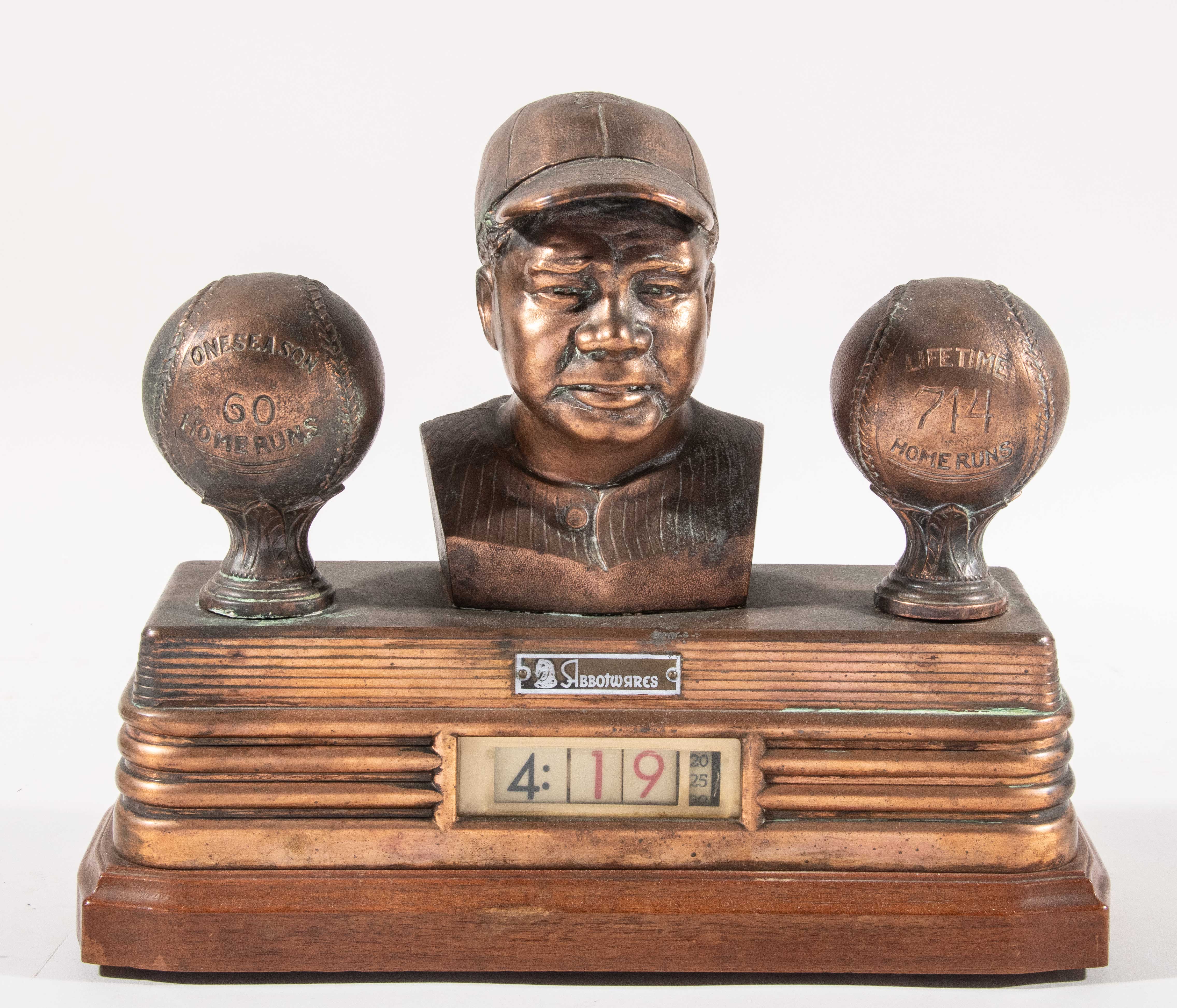 Description:Babe Ruth figural clock from the Ruth Collection c.1940s Vintage electric clock features a metal bust of Ruth flanked by two baseball finials bearing career highlights and finished in a bronze plated surface. Hour, minutes, and seconds appear in window at center with a wood base at bottom. All original and very well preserved with pleasing patina and some light general wear. Originally offered by Hunt Auctions in our June 2019 sale of the Babe Ruth Collection (lot 157) however the letter of provenance has been misplaced. An LOA from Hunt Auctions will be included: EX-EX/MT