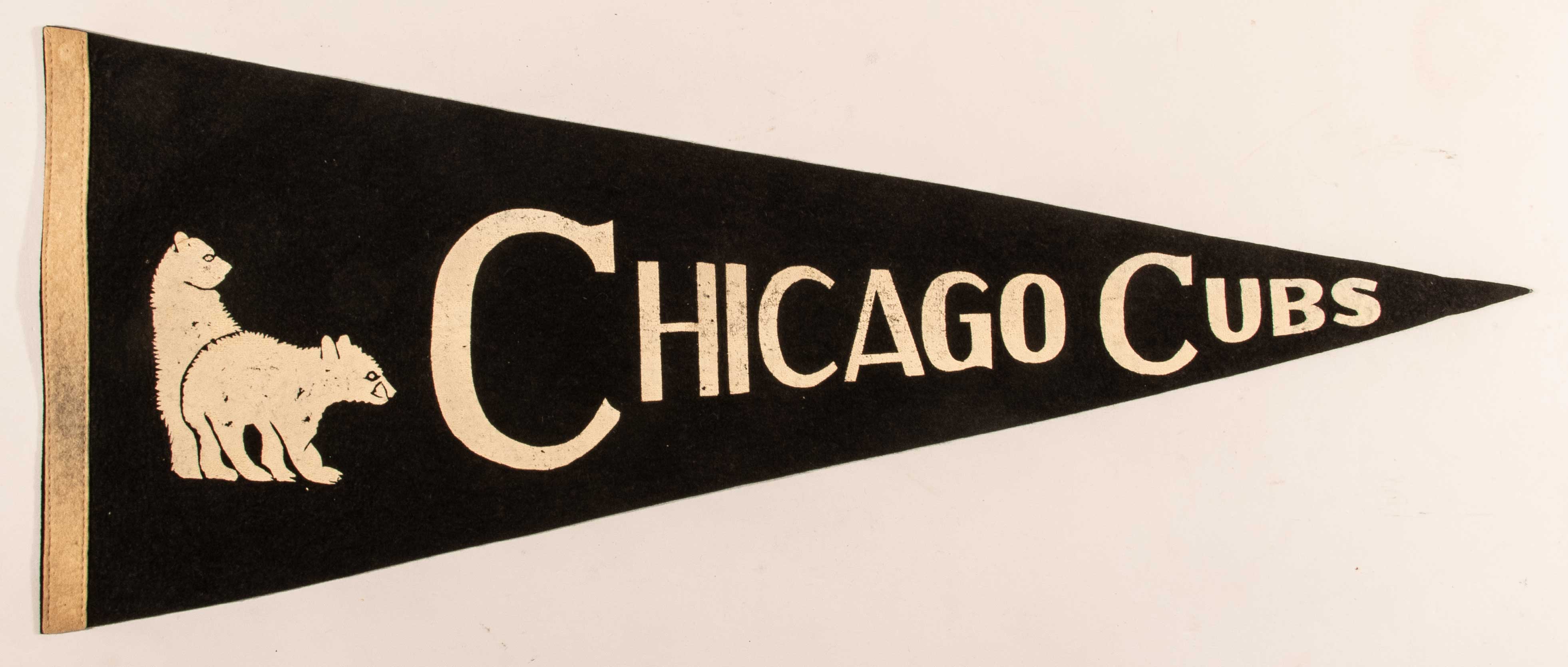 Very rare Chicago Cubs vintage pennant c.1930s. 27.5" black pennant with white graphic and lettering. Minor tack holes, and discoloration along the white left edge: EX