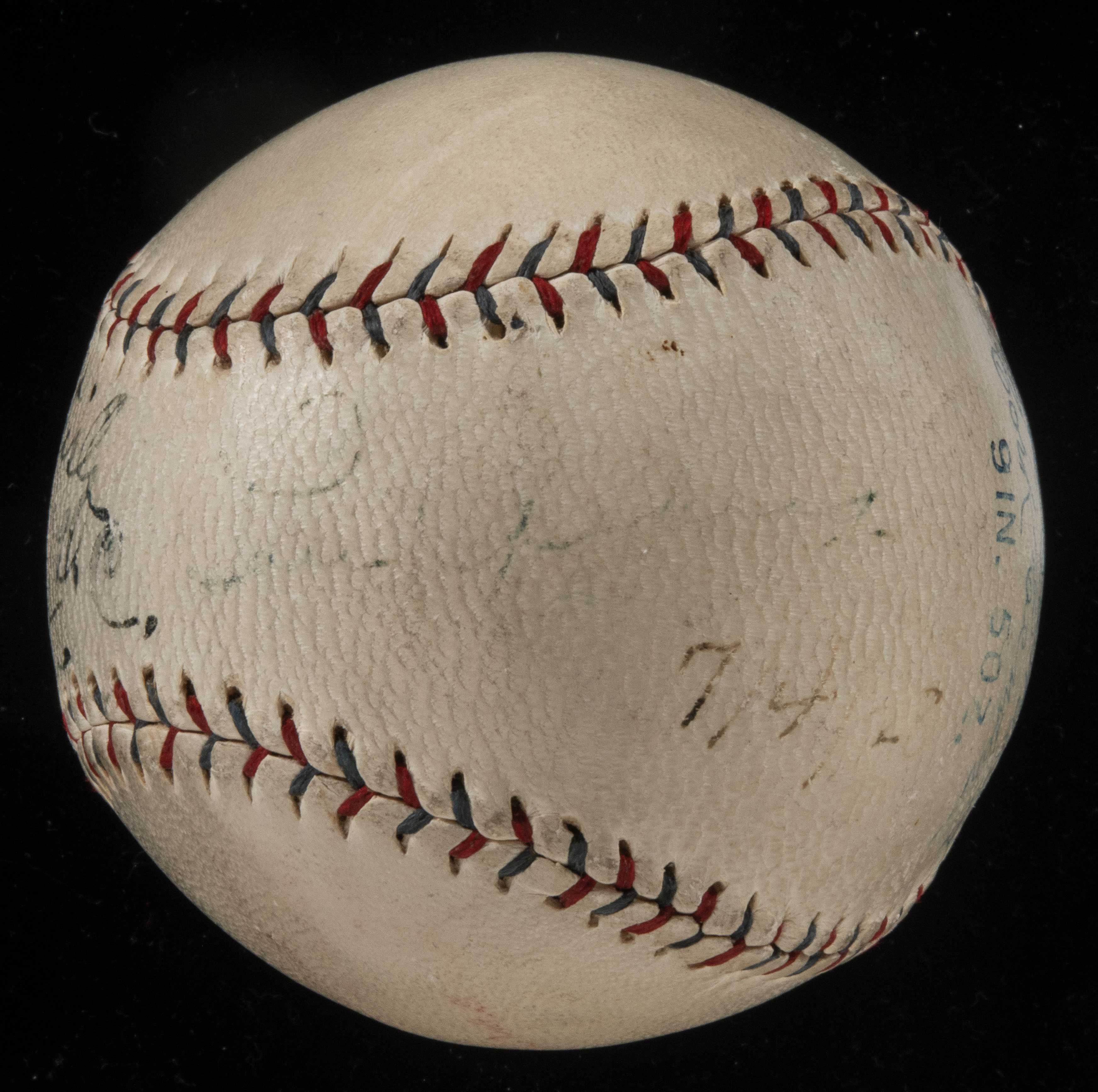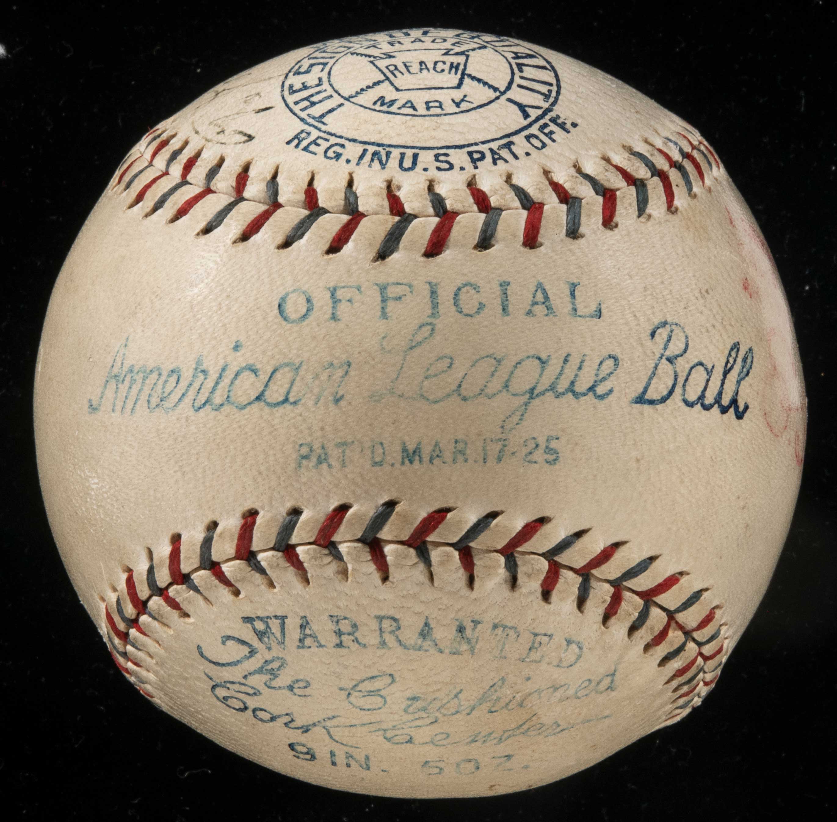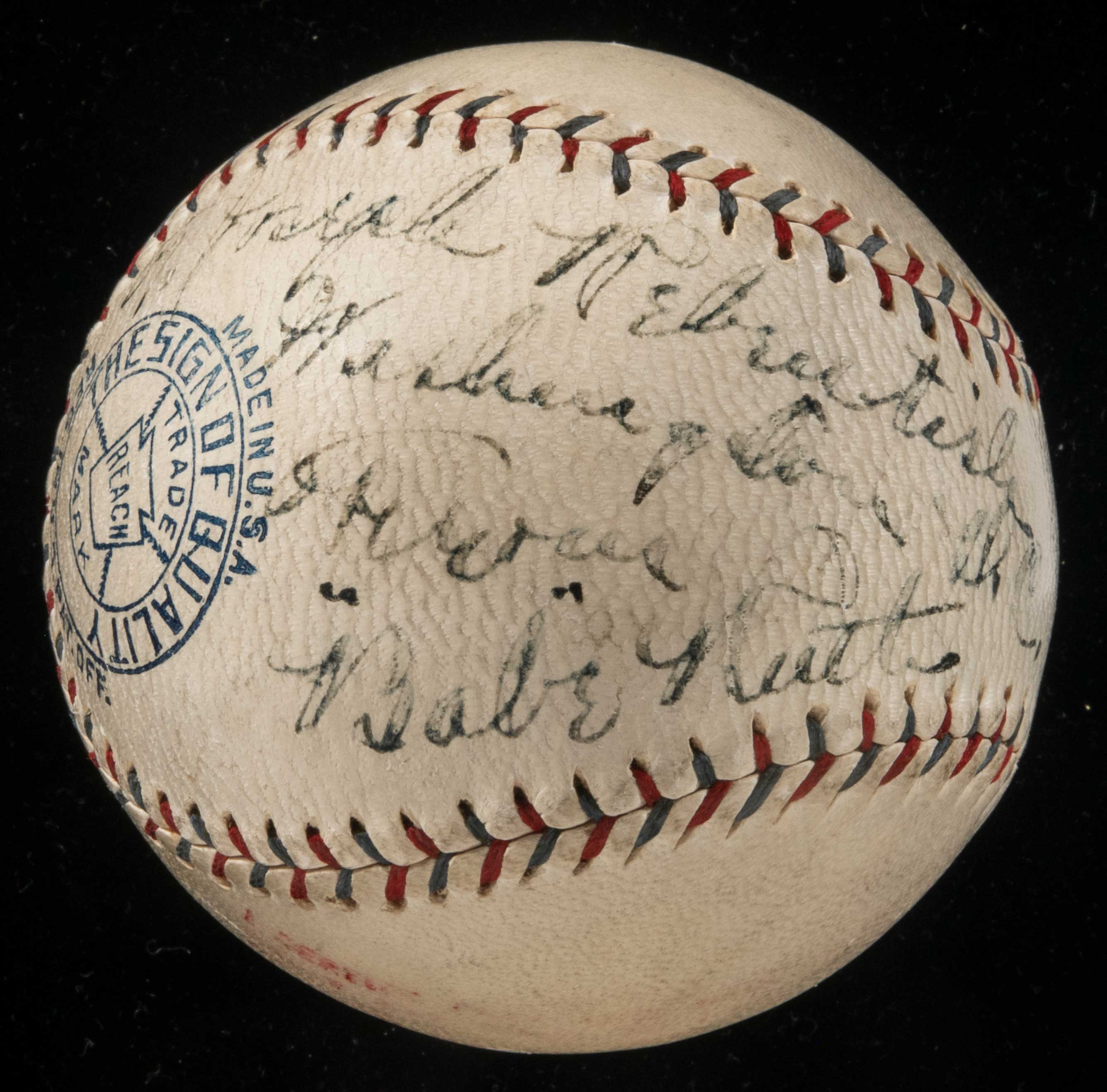 Description:Babe Ruth and Lou Gehrig autographed baseball c.1928: Dated July 4th and inscribed "Washington" (PSA/DNA "4" overall). Red and blue stitched Reach E.S. Barnard Official American League baseball has been signed on the side panel, "To Joseph Rebentish, Washington D.C., From Babe Ruth." Just to his right is a "Lou Gehrig" signature. The Ruth has been graded "5" by PSA with Gehrig a "3", averaging to a grade of "4" overall. The date "7/4/28" is written on in unknown hand. The Yankees played a doubleheader against the Senators on that day winning one game and losing the other. Ball displays mild even toning with well defined stampings. Includes full LOA from PSA/DNA: Sigs. PSA "4" overall, Ball EX