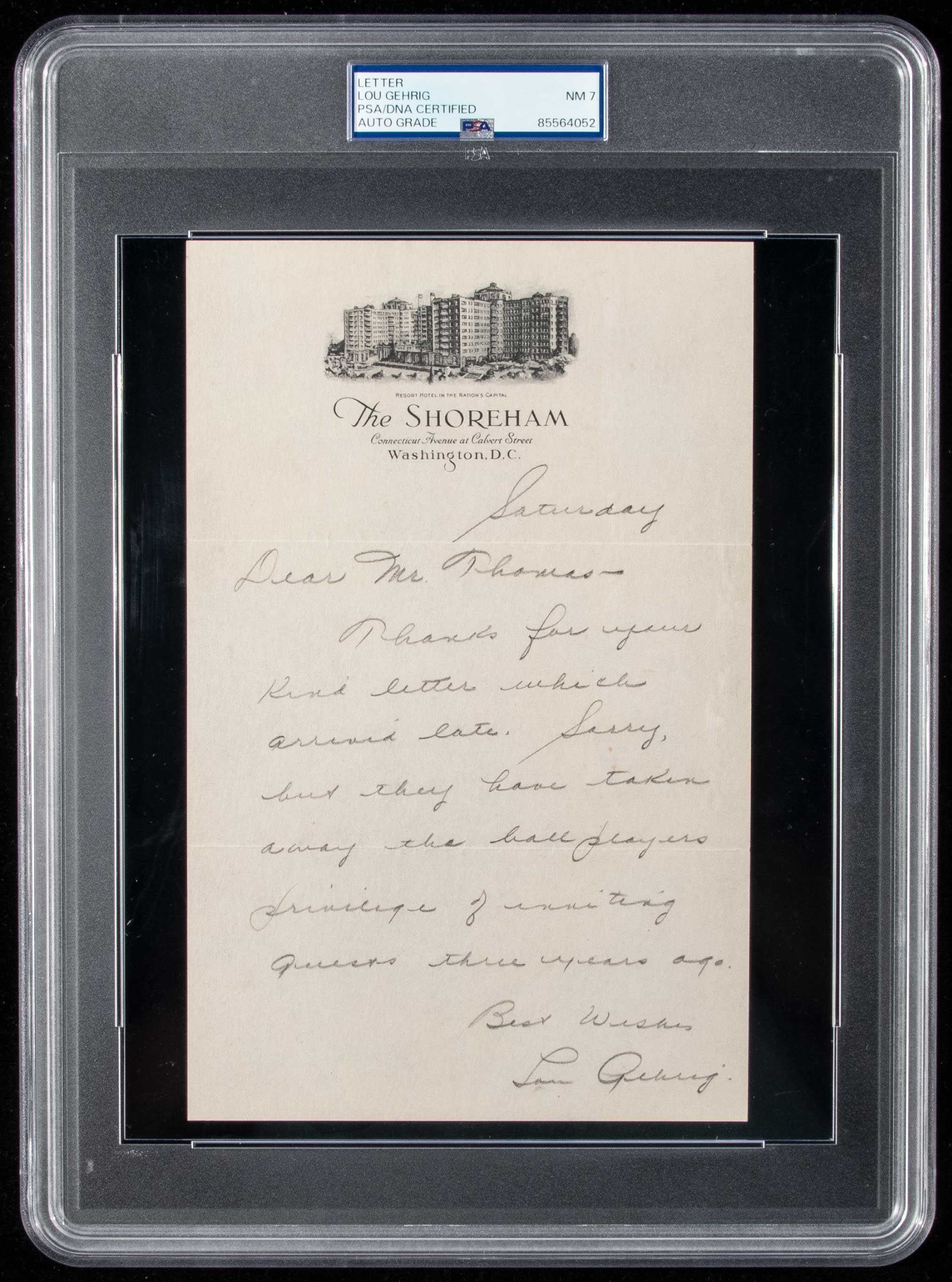 Description:Fine Lou Gehrig handwritten letter c.1930s (PSA/DNA NM 7). Handwritten letter filling a sheet of "The Shoreham…Washington, D.C." stationary has been signed "Best Wishes, Lou Gehrig." Contents reads "Thanks for your kind letter which arrived late. Sorry, but they have taken away the ball players privilege of inviting guests three years ago." Authenticated and encapsulated by PSA with the autograph graded NM 7. Paper displays light even toning with typical mailing folds. While undated the letter was clearly written to a fan during Gehrig's time with the Yankees. He would then have been among the more prominent players in the game and the care with which he responded illustrates the high regard he held for his followers: Sig. PSA/DNA NM 7, Letter VG