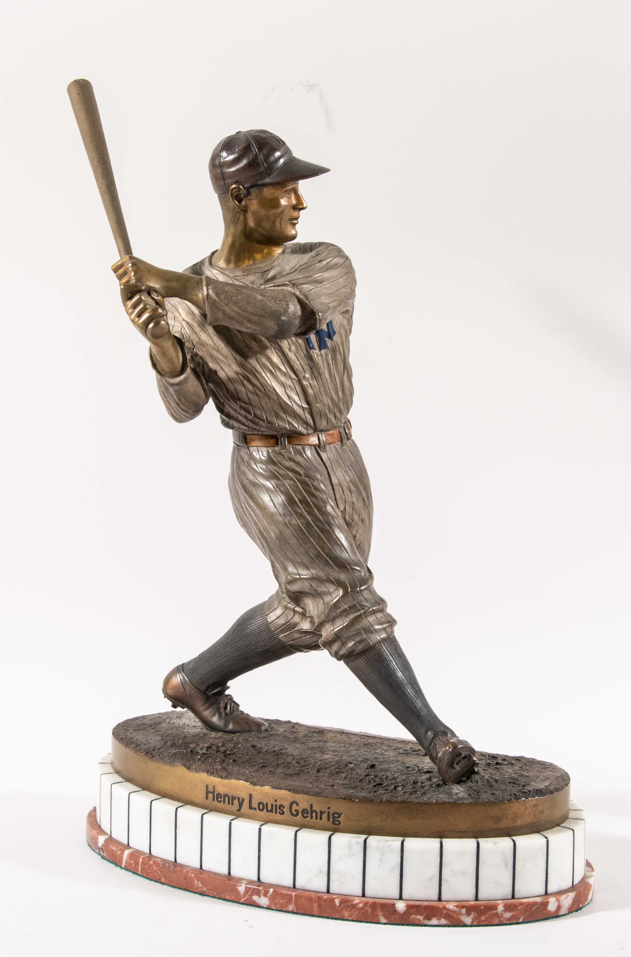 Description:"The Pride of The Yankees" (Lou Gehrig) bronze sculpture by R.P. Daus c.1988. Substantive bronze likeness of Gehrig is exceptionally well done showing the legendary Hall of Famer in pinstripes. "The Pride of the Yankees" impressed titling is incorporated along one side with the other reading "Grand Slam." Marked "R.P.Daus" beside foundry hallmark. In fine overall condition with some light natural age. Striking display qualities at 16.75" tall with base measuring 11.5" across: EX-NM