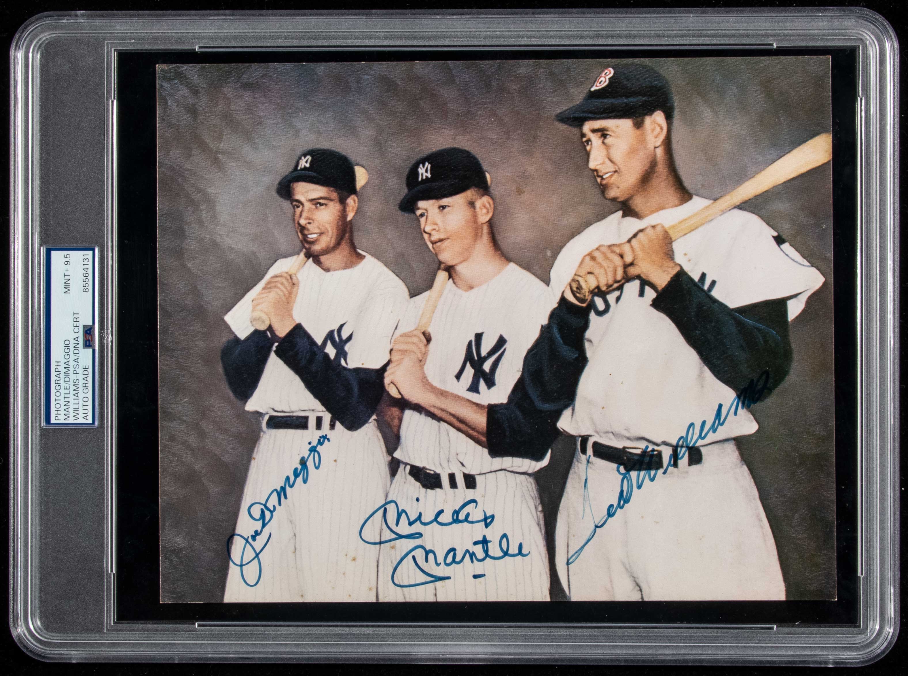 Description:Mickey Mantle, Ted Williams, and Joe DiMaggio signed 8"x10" photograph (PSA/DNA Mint+ 9.5). Colorized photograph has been signed by all (3) legendary outfielders in marker with the autographs graded Mint+ 9.5 by PSA. Hint of light corner/edge wear: PSA/DNA Mint+ 9.5