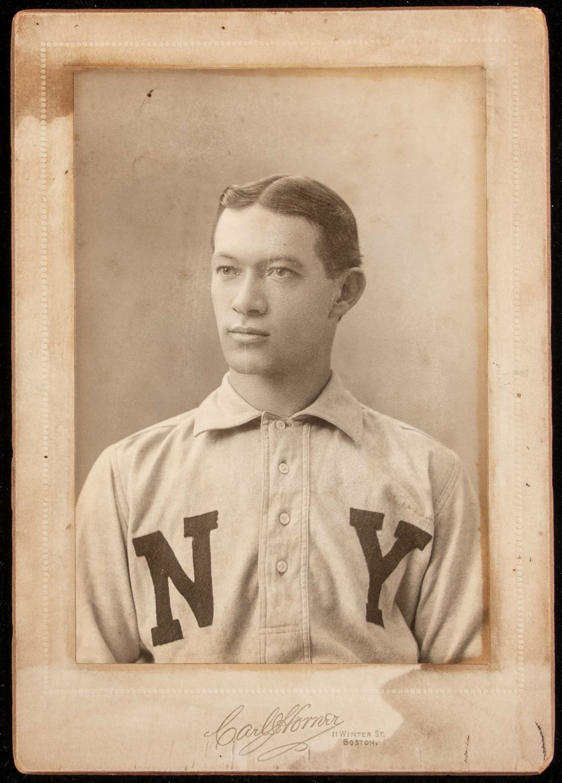 Description:Doc Marshall cabinet photograph by Carl Horner c.1904-06. Sepia toned image remains on its' original "Carl J. Horner" marked 5"x7.25" mount. Scattered wear includes some corner chipping and areas of toning/discoloration and moisture staining. Includes LOA from PSA/DNA graded "Type I." Handwritten identifier on back: FR/GD
