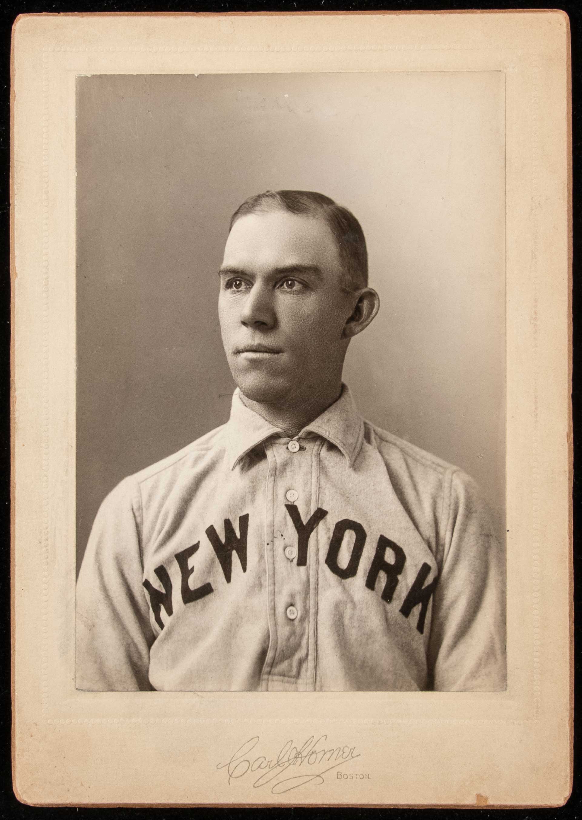 Description:Dan McGann cabinet photograph by Carl Horner c.1902-07 (T206, W600 Sporting Life, and Fan Craze card image). Sepia toned studio portrait remains on its' original "Carl J. Horner" marked 5"x7.25" mount. Minor scattered wear and there are handwritten identifiers and some other markings on back. Includes full LOA from PSA/DNA graded "Type I": VG/EX