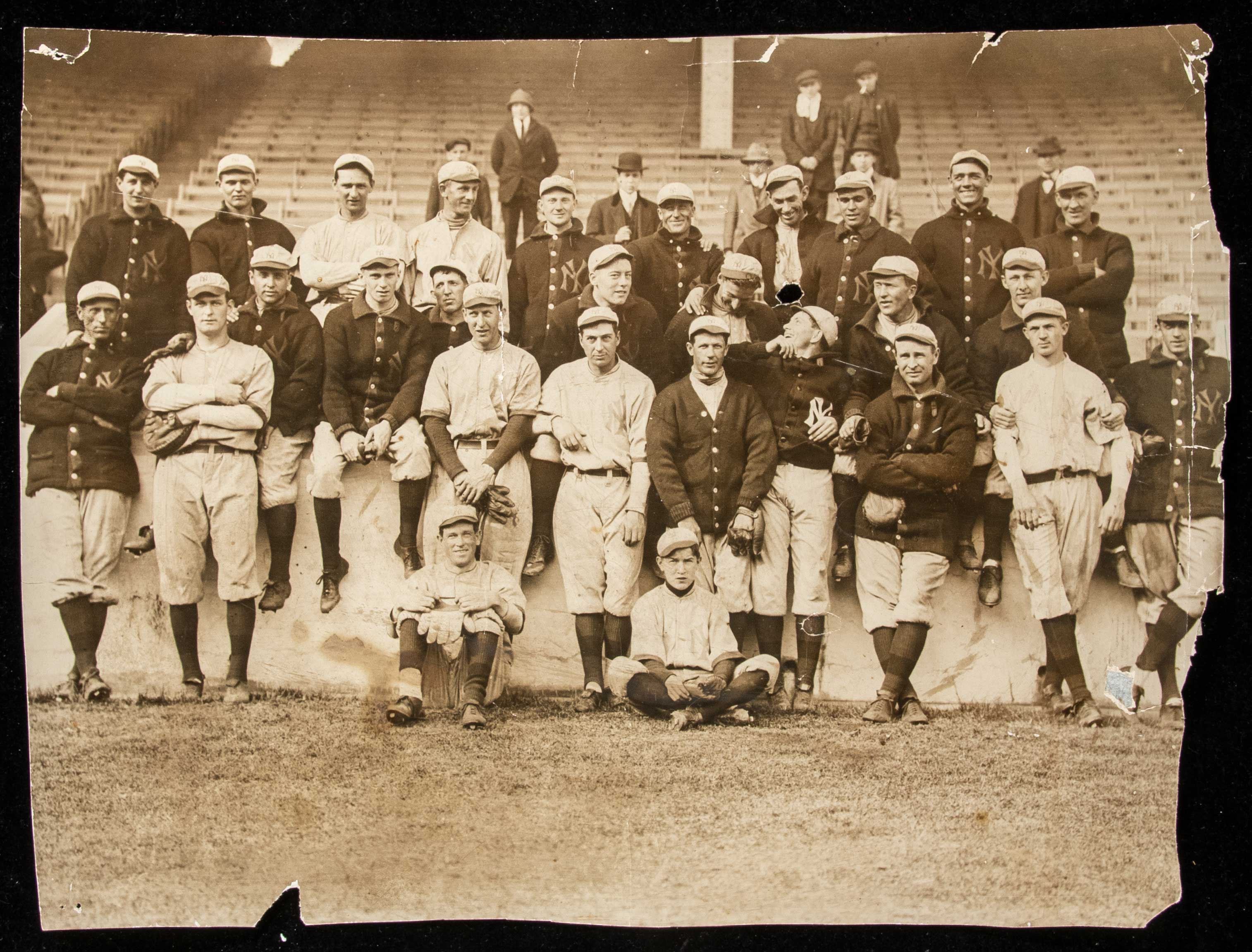 Description:1913 New York Yankees large format team photograph. Sepia toned 9.75"x13" photograph showing team members including Hal Chase and Frank Chance whom only overlapped in 1913. Light toning with scattered wear to include chipping, creases/wrinkles, and some tears (these have been secured from behind with conservation tape). There are a few flaws to the central portion but much of the damage to the perimeter could be a least partially matted out when framed for display. A fine image dating the first season the team would be known as the Yankees: FR