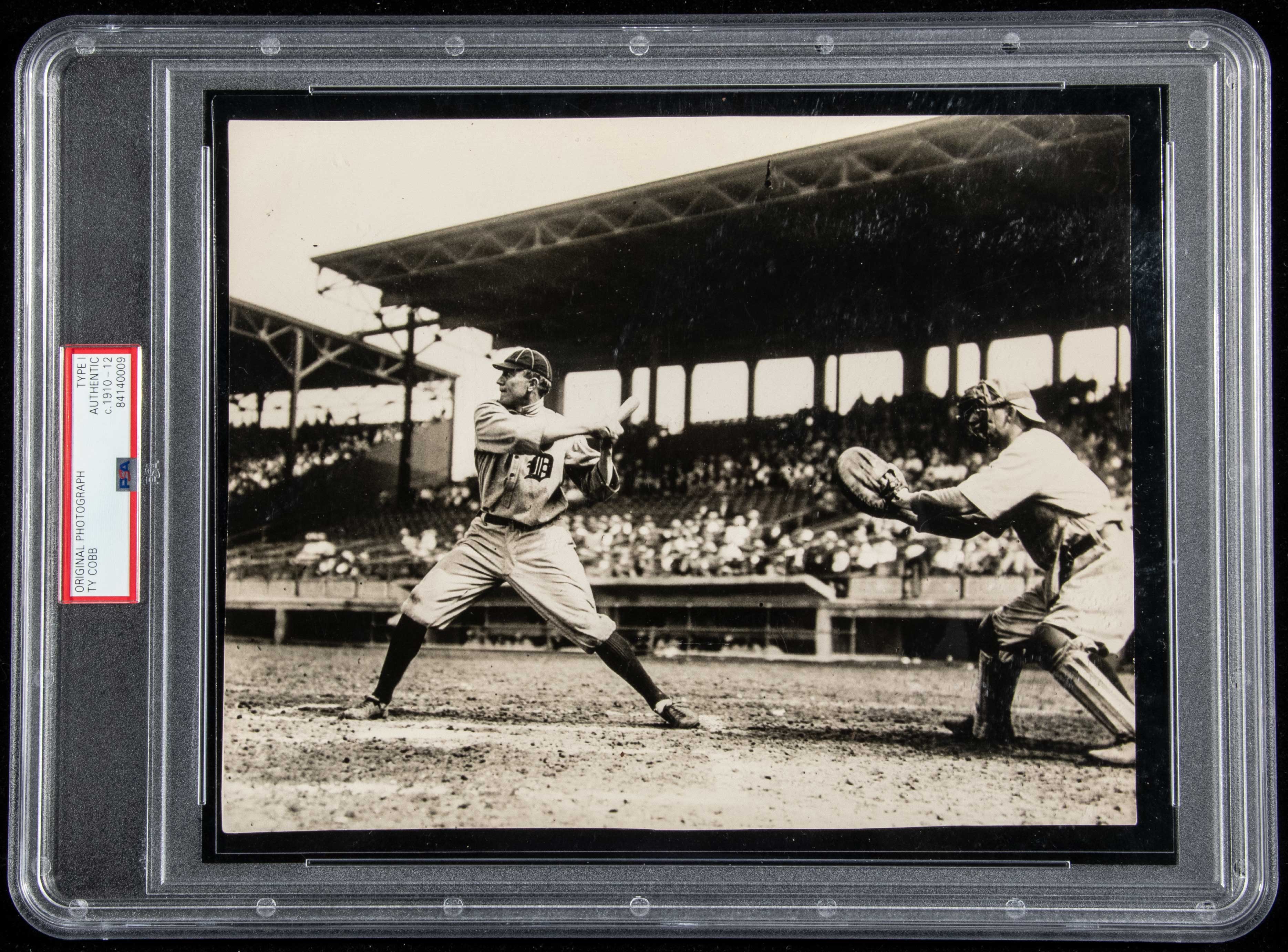 Description:Museum quality Ty Cobb photograph c.1910-12 (PSA/DNA "Type I"). Rare early image of Ty Cobb at bat offers a striking view of his form with bat being drawn back in anticipation of an incoming pitch. Art like qualities with perfect focus on the batsman and both the background and catcher appearing more muted. Action shots in this style are highly uncommon for this era and we submit that this ranks firmly among the best images of Cobb taken at the time. Further, it is just under 8"x10" in size which is likewise seldom seen for the period. In very fine overall condition with a hint of light toning a little mentionable wear. Authenticated and encapsulated by PSA ("Type I"): EX