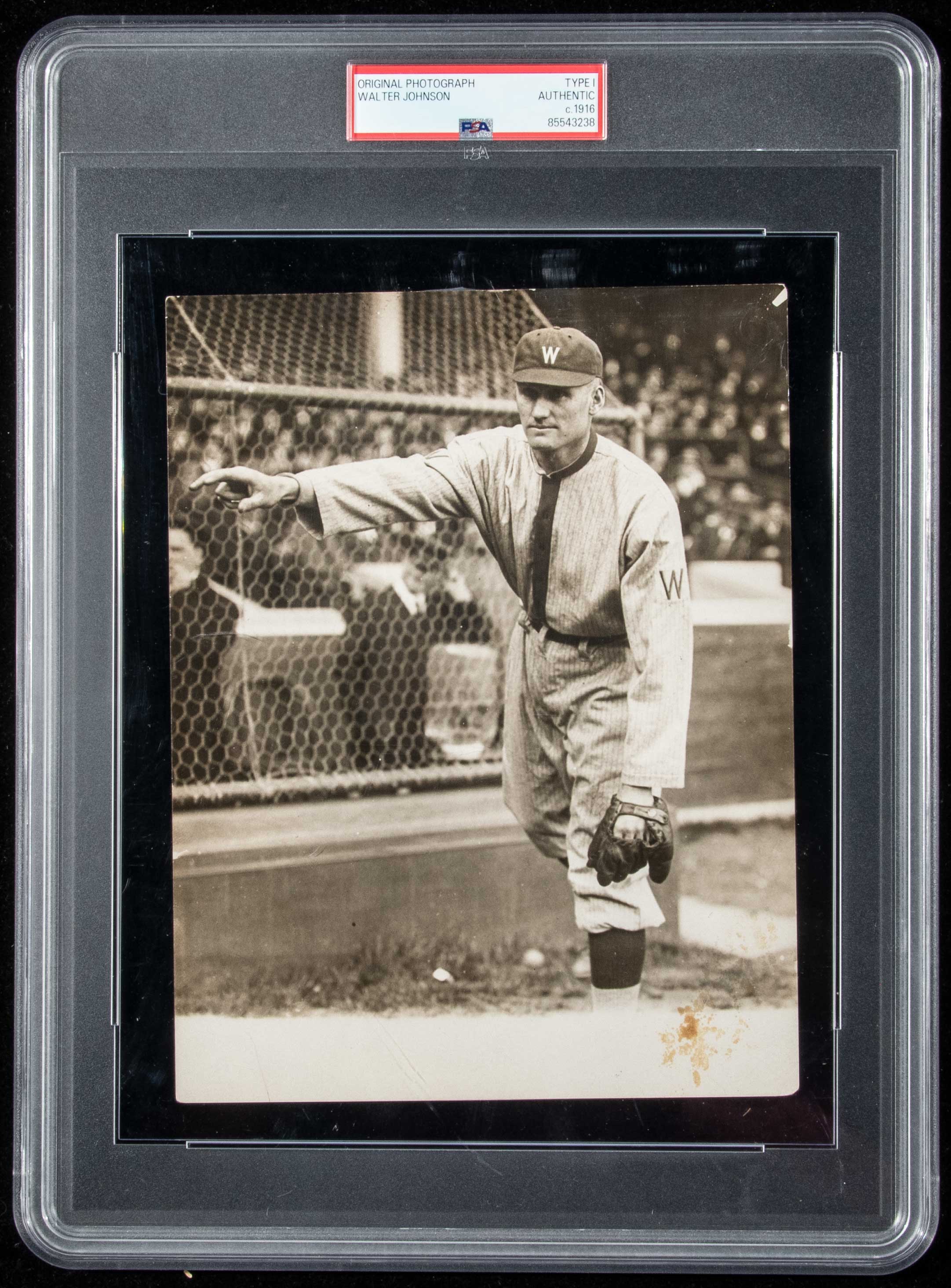 Description:Walter Johnson photograph c.1916 (PSA/DNA "Type I"). Choice sepia toned photograph (6.5"x8.5") offers a full length throwing pose of Johnson while with the Washington Senators. Handwritten notations on the back include the year "1916" which was the height of his Hall of Fame career and he would he would lead the American League in wins and strikeouts for the 5th consecutive season. Fine overall condition with a touch of light and some minor discoloration to lower right front corner. Authenticated and encapsulated by PSA: VG
